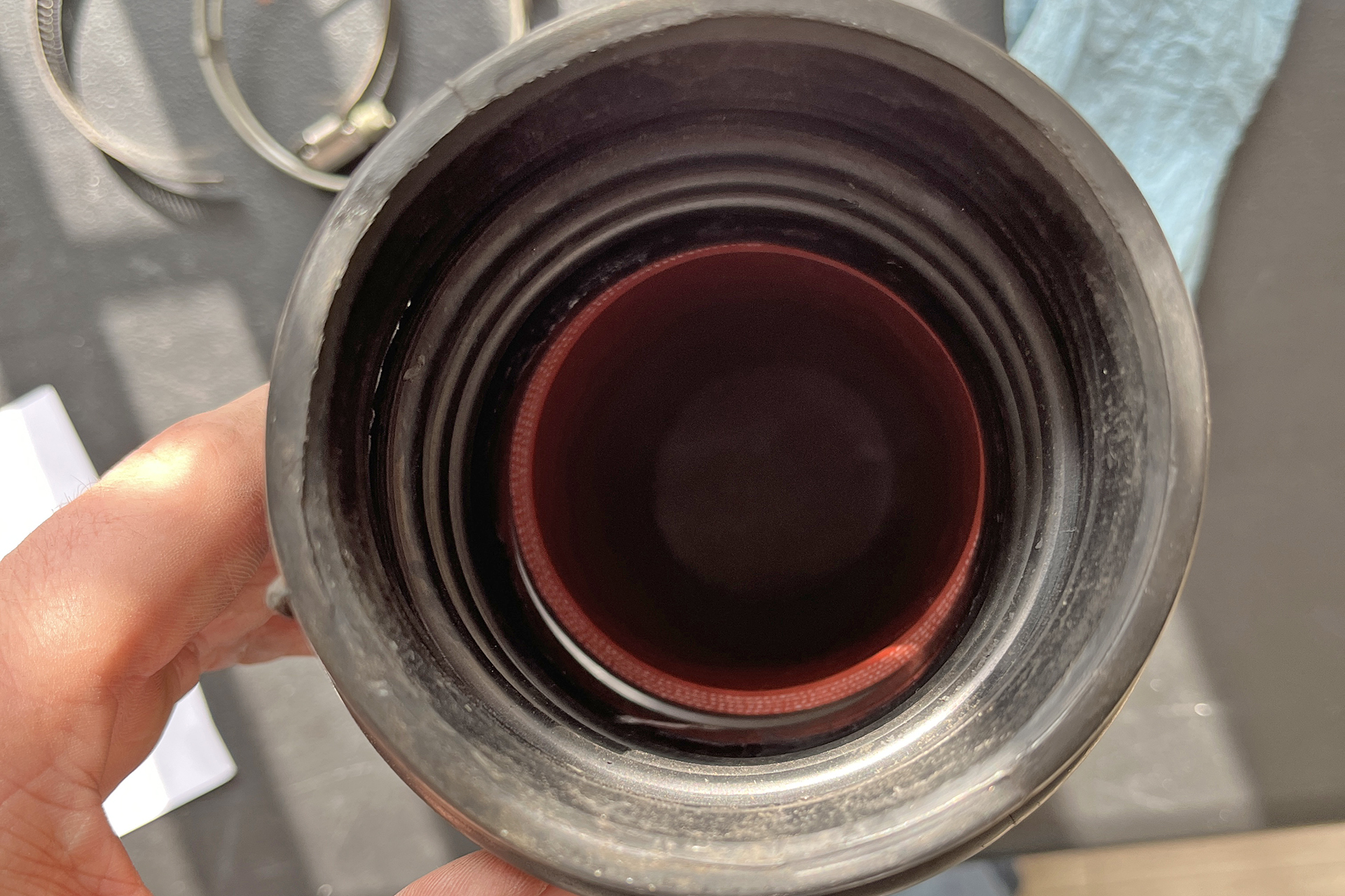 When it arrived, I yoinked the old hose out (confirming that, holy crap, that thing was roached) and tried to fit the new one … only to realize it was too small. Though I made my best effort at squeezing it over the lips of the hard pipe, silicone is not as easily re-shaped as soft rubber (one of its advantages, when it’s sized correctly) and it just wasn’t happening. I had to give up.