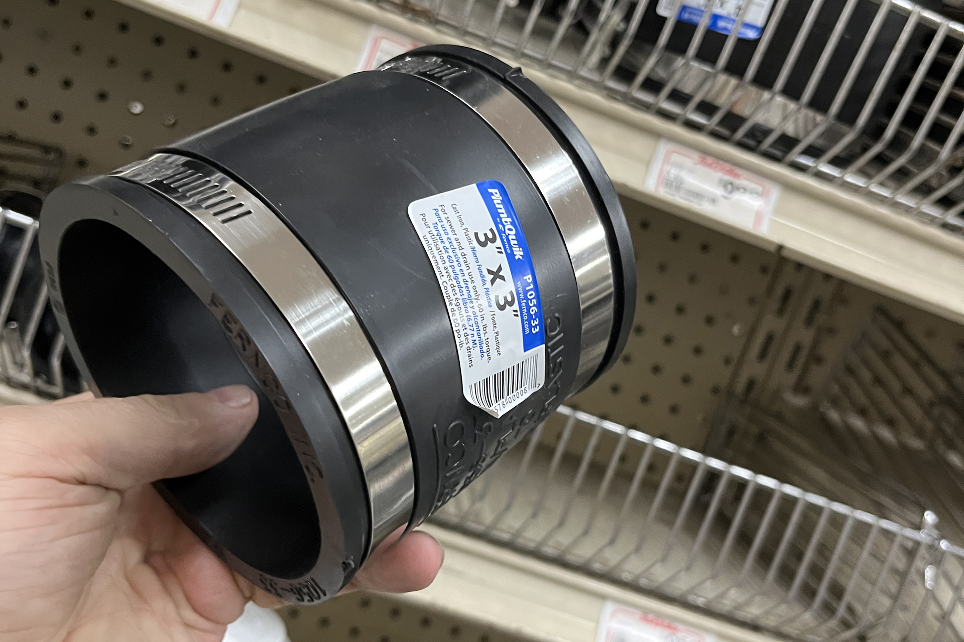 I hiked to a hardware store and found a three-inch long and three-inch wide rubber coupler hose—the size was pretty much spot on when I compared it to the scrap of paper I’d ripped into approximately the shape of the desired hose. It was labeled as a plumbing product and came with two appropriately sized hose clamps. $7.99 later and it was in my hands.