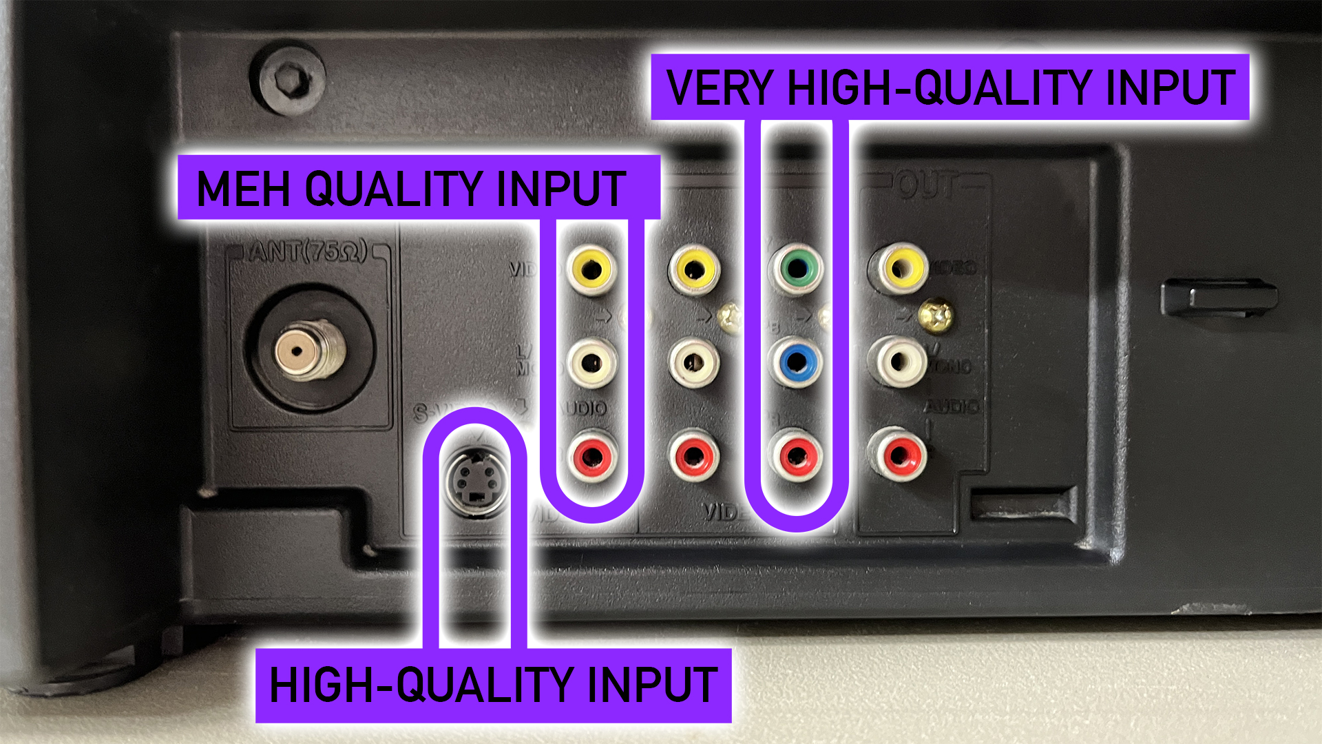 Even so, I was wary about putting a gigantic old-school TV in my house, but one popped up on my local Craigslist Free section I couldn’t pass up: a 2003 Toshiba (toward the end of CRT tech’s reign), with S-Video and Component inputs (generally PS2’s best native connection type… we’ll come back to that later), and a 20-inch diagonal screen. That’s perfect for sitting close and getting the old look I wanted without gobbling too much square footage or requiring two people to move.