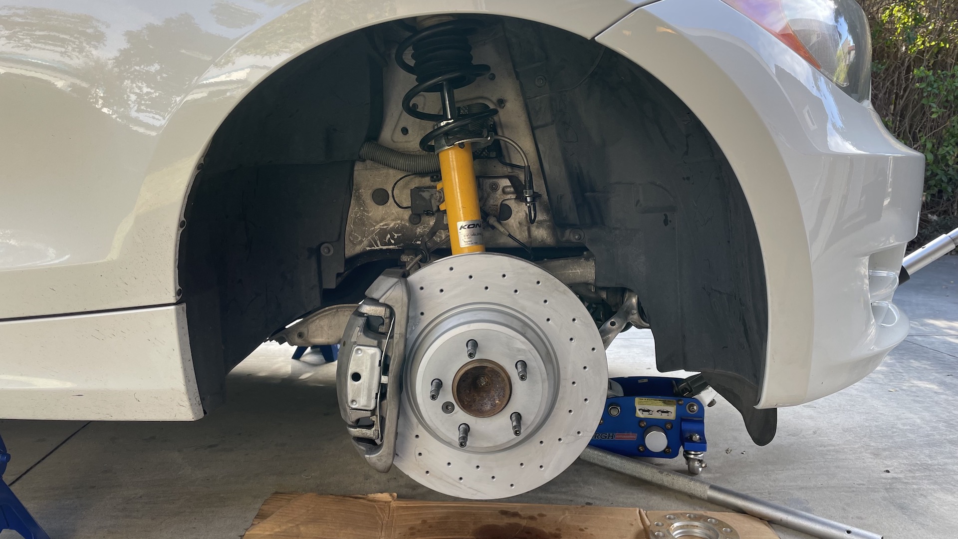 Brake jobs on most cars are incredibly easy, but it’s especially easy on BMWs. All of the 335i parts bolted up perfectly in the 128 parts’ place. Even the caliper swap is simple enough, as all you need to do is first disconnect the flexible brake line at the hard-line, then at the caliper, unbolt the caliper, and do the reverse for reinstallation.