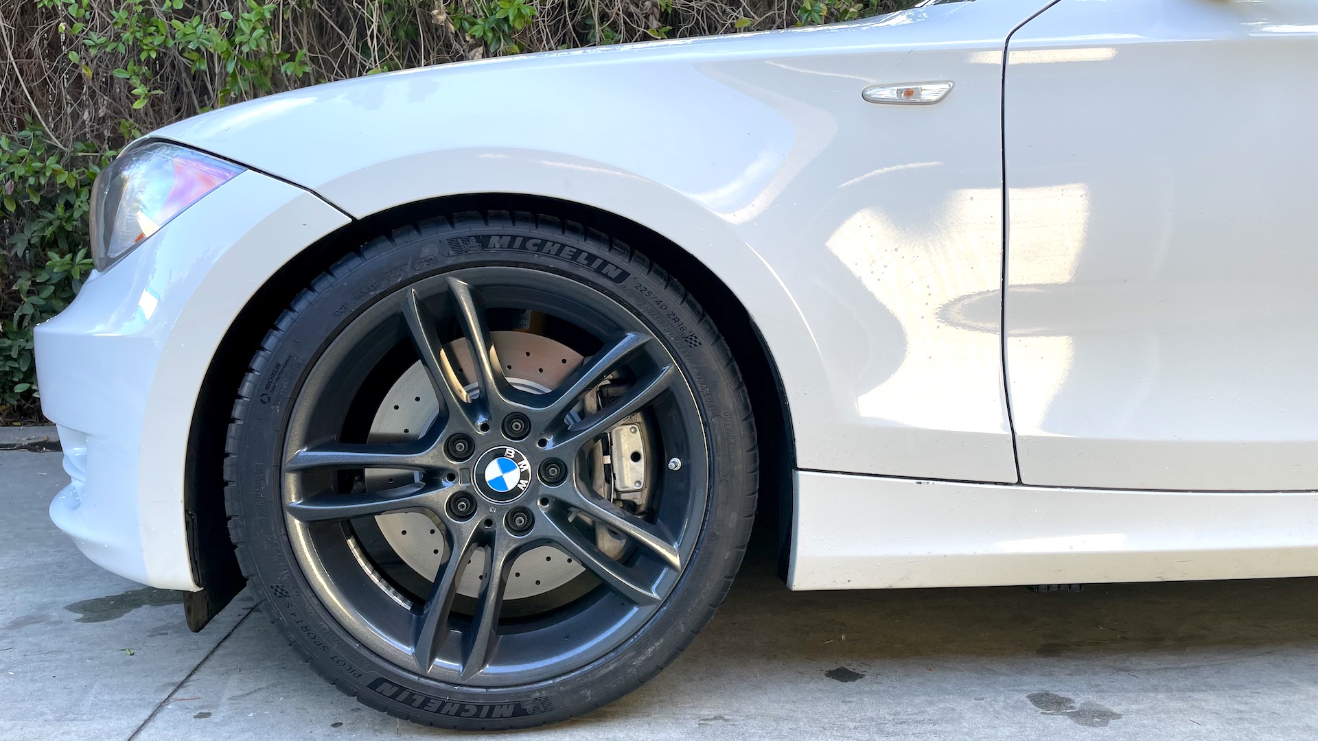 A few readers, however, have replied to my updates that I should consider E9X 335i brakes. That was especially true after I briefly raved about driving my buddy Rob’s E92 M3 with its massive OEM single-piston calipers and accompanying rotors. 335i brakes aren’t quite the same size, but they’re still noticeably larger than the base 128i equipment. In my constant daze of memorizing BMW’s massive parts potential and aftermarket, I for some reason thought they meant the multi-piston Brembo units that came with the E82 135i. Stuff that’s a bit much for my bank account. But nope, these are far less fancy, and therefore far less expensive. Like, several hundred dollars less expensive.