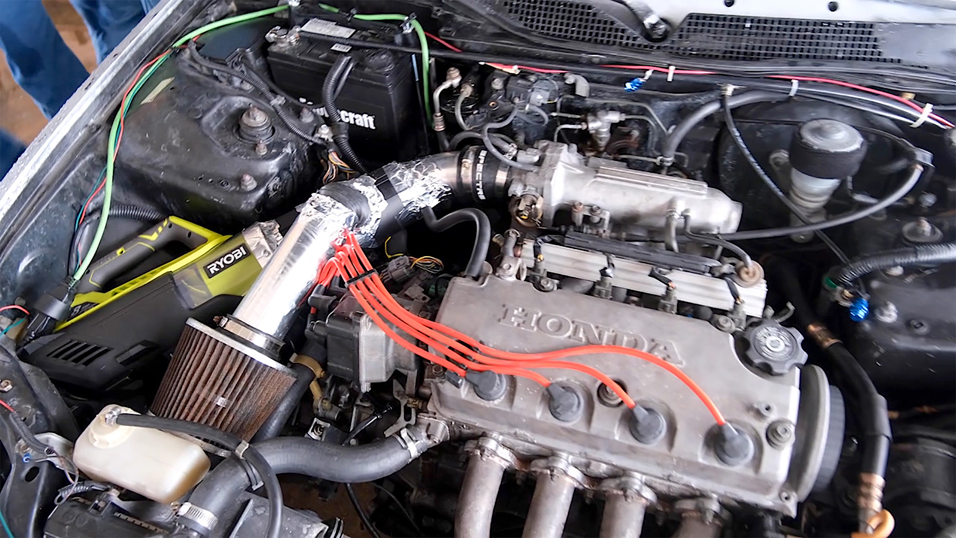 The channel’s Marty and Moog hooked up two small lithium-powered Ryobi leaf blowers to the hood of a heap-spec Daihatsu, fired them up, and attempted to force enough air into its teeny intake to show a noticeable increase in power on the dyno. They were not successful.