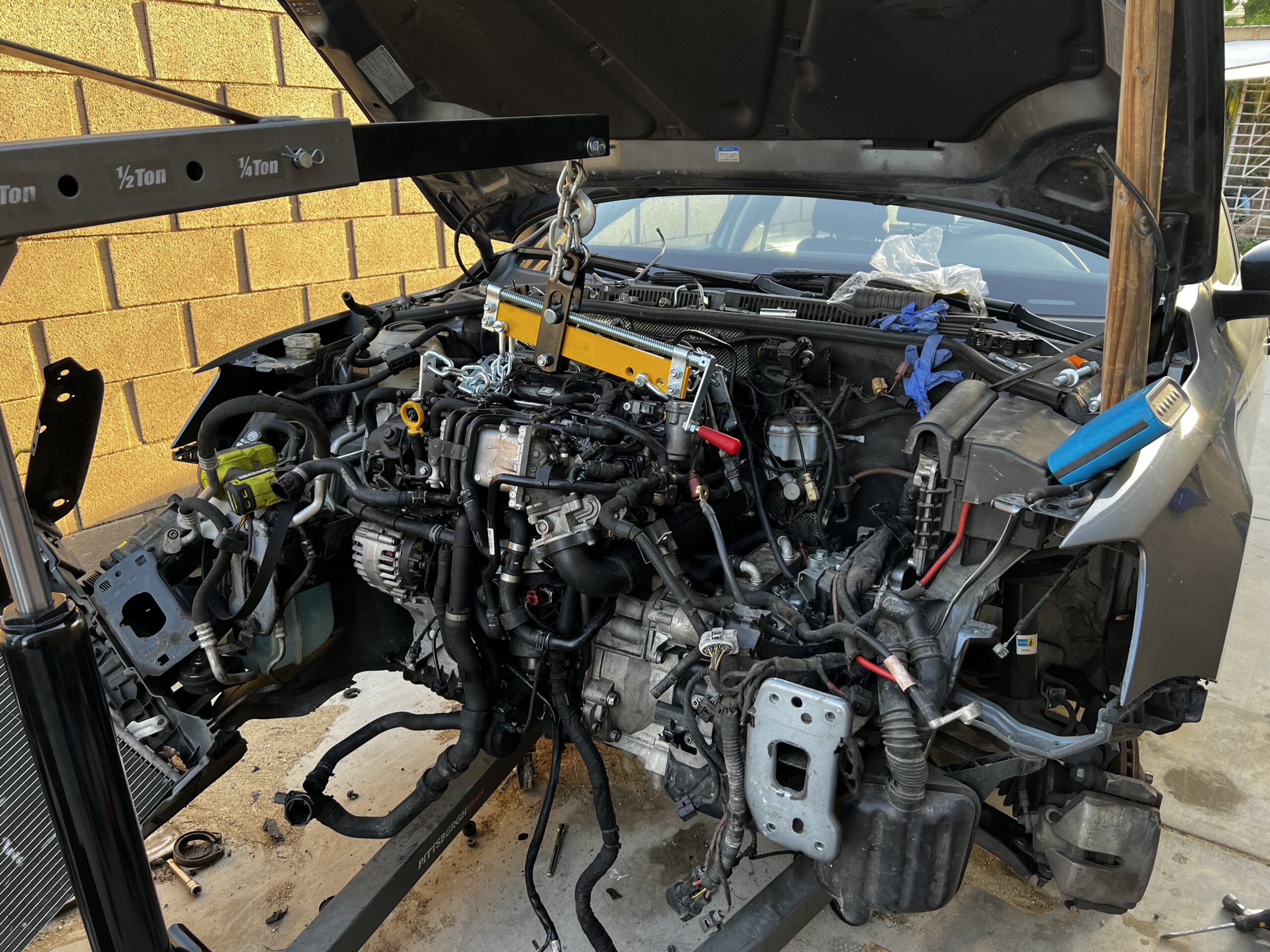 My game plan to minimize mistakes was to remove the blown engine first and place the two engines side by side, piecing things together on the new engine as I disassembled the blown one. Normally I wouldn’t be so cautious, but the photos should speak for themselves; this engine is intense. There are coolant hose connections and hard lines everywhere, a thicket of wiring, and many air pipes that either feed charge air, EGR, or vacuum. It’s something of an engineering marvel.