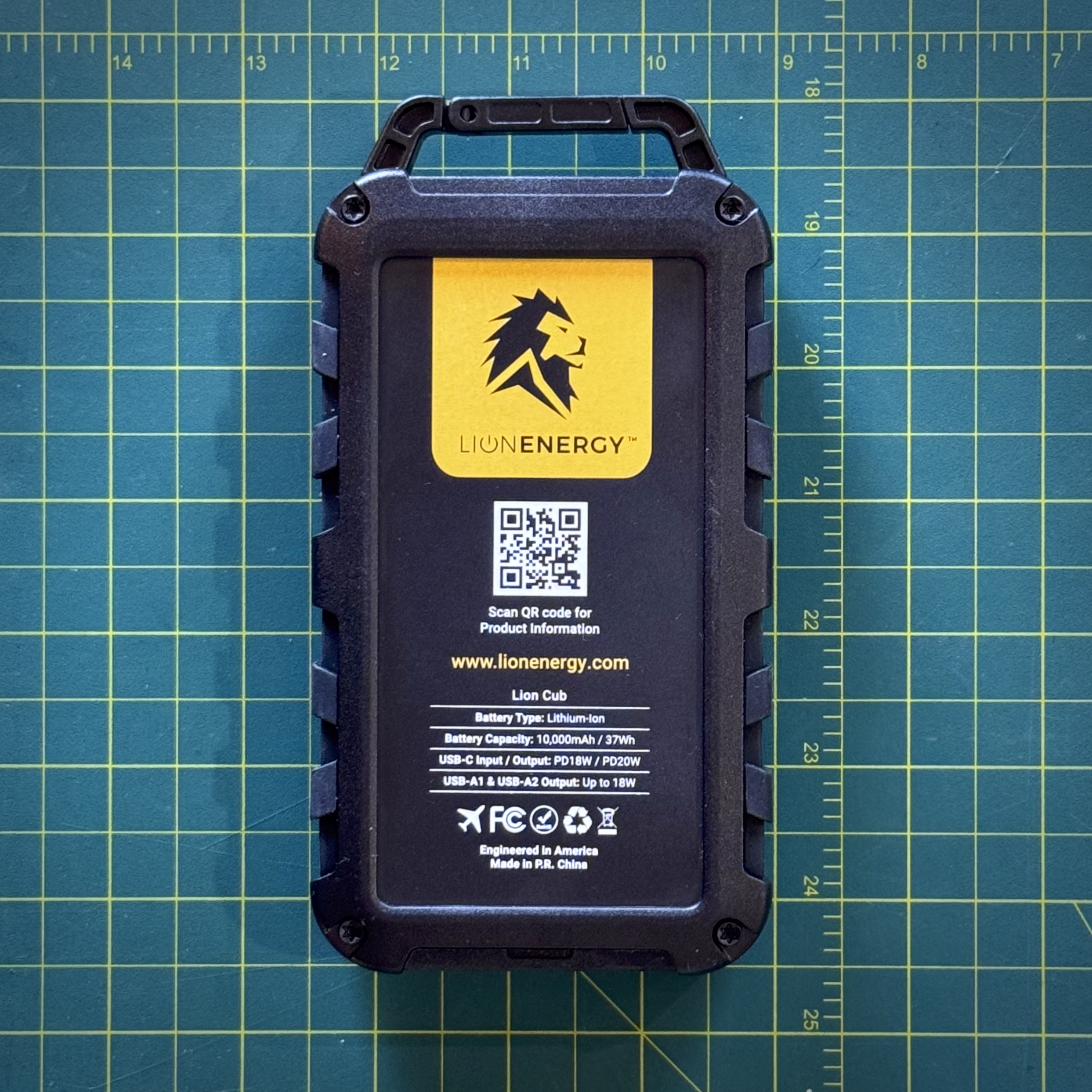Let’s start with the simpler, and more portable, everyday carry-focused Cub. It isn’t much larger than my iPhone 15 ProMax. As I write this, it’s selling for $29.00 on Amazon. Lion Energy rates it at 10,000 mAh, in actual testing, I got about 6,000 mAh of real-world performance. That capacity will charge my iPhone or my Macbook Air M2, from 20% to 80% about twice. The Cub has a single USB-C and two USB-A ports. The USB-C is input/output, and the USB-A is output only. The built-in flood light seems more useful than the spot/flashlights other devices use. It also has a carabiner-style clip on the top end, which is less useful. It does include an actual mini-carabiner in the box.