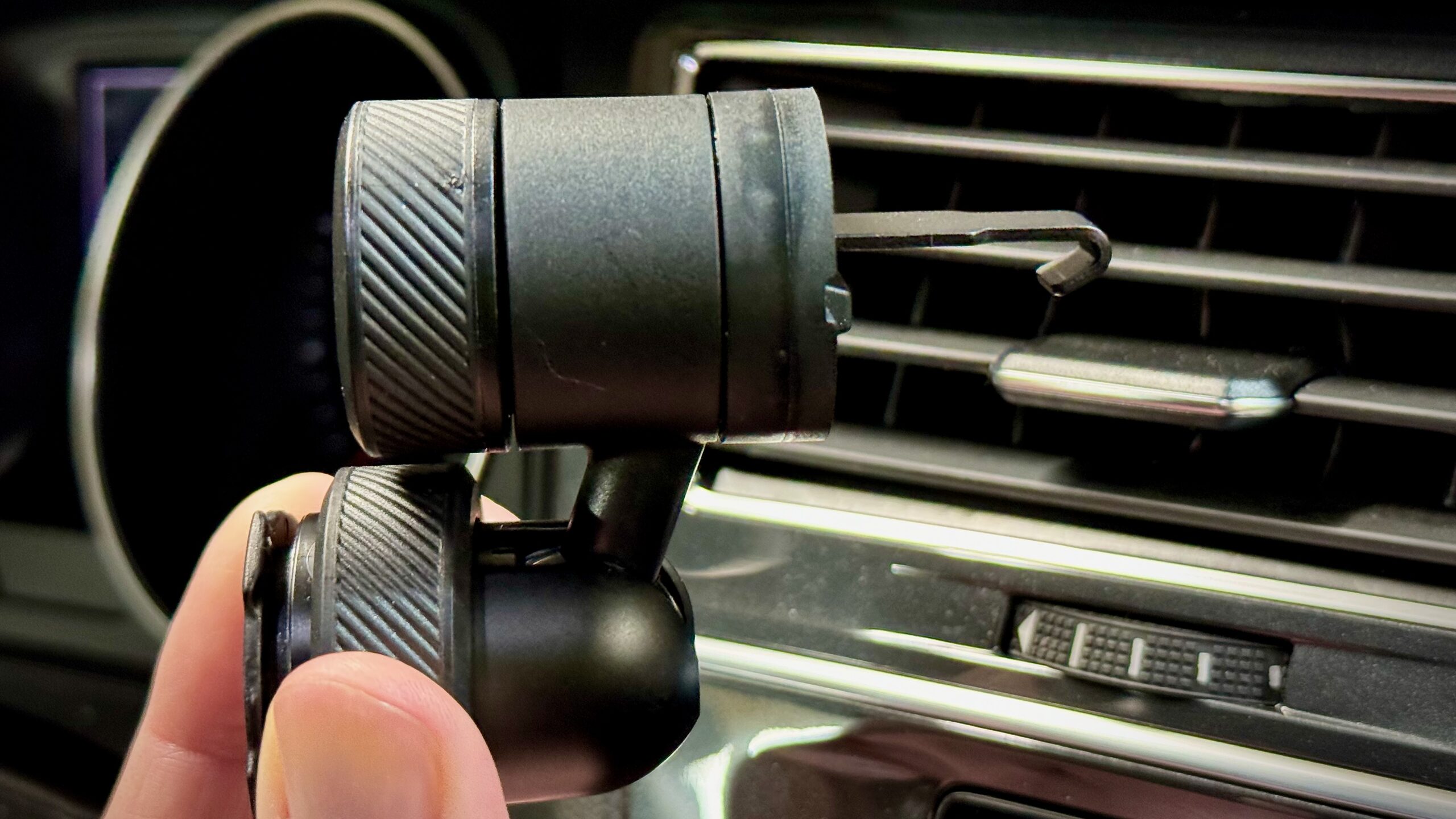 Quad Lock offers four different styles of car mounts. Two styles of adhesive mounts, one suction mount, and the vent mount—I chose the last. I’ve tested some vent mounts in the past that have broken in a matter of hours, not only liberating my phone to bounce around the car but also sending cheap plastic shrapnel down into my vent plenum. This mount is far better constructed and I’ve had it in my car for a few months with no issues. It has a metal hook that grabs the back of a vent slat and tightens onto that. The mounting face for the phone can be adjusted as it is mounted on a ball joint, making it easy to get it pointed at you.