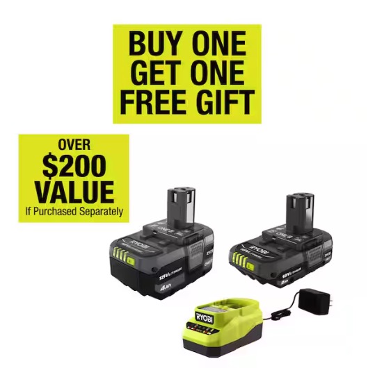 We know what you get free, so what do you buy to get the free tool? There are two deals, both offering savings on the combo itself. The first is a ONE+ 18V Lithium-ion Starter Kit for $99.00. If you’re new to Ryobi or need to stock up on battery packs, this is a great choice. You get a 2.0Ah and a 4.0Ah battery along with a charger. The retail price for the three times is $203.94, plus you get to pick a free tool, so that’s a great deal.