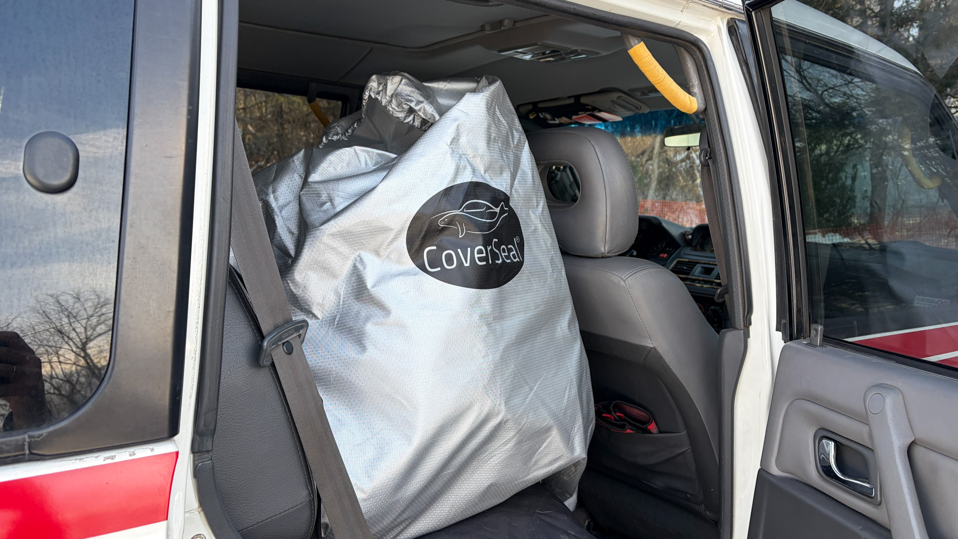 CoverSeal’s PR outfit sent me an XL SUV-sized cover to put on my Scout, which is currently hibernating for the winter, and it’s quite heavy. Like, over 40 pounds. That made it a little challenging to carry through the very crowded barn my Scout’s being stored in right now, but apparently it’s a lot easier to toss on with the right technique.