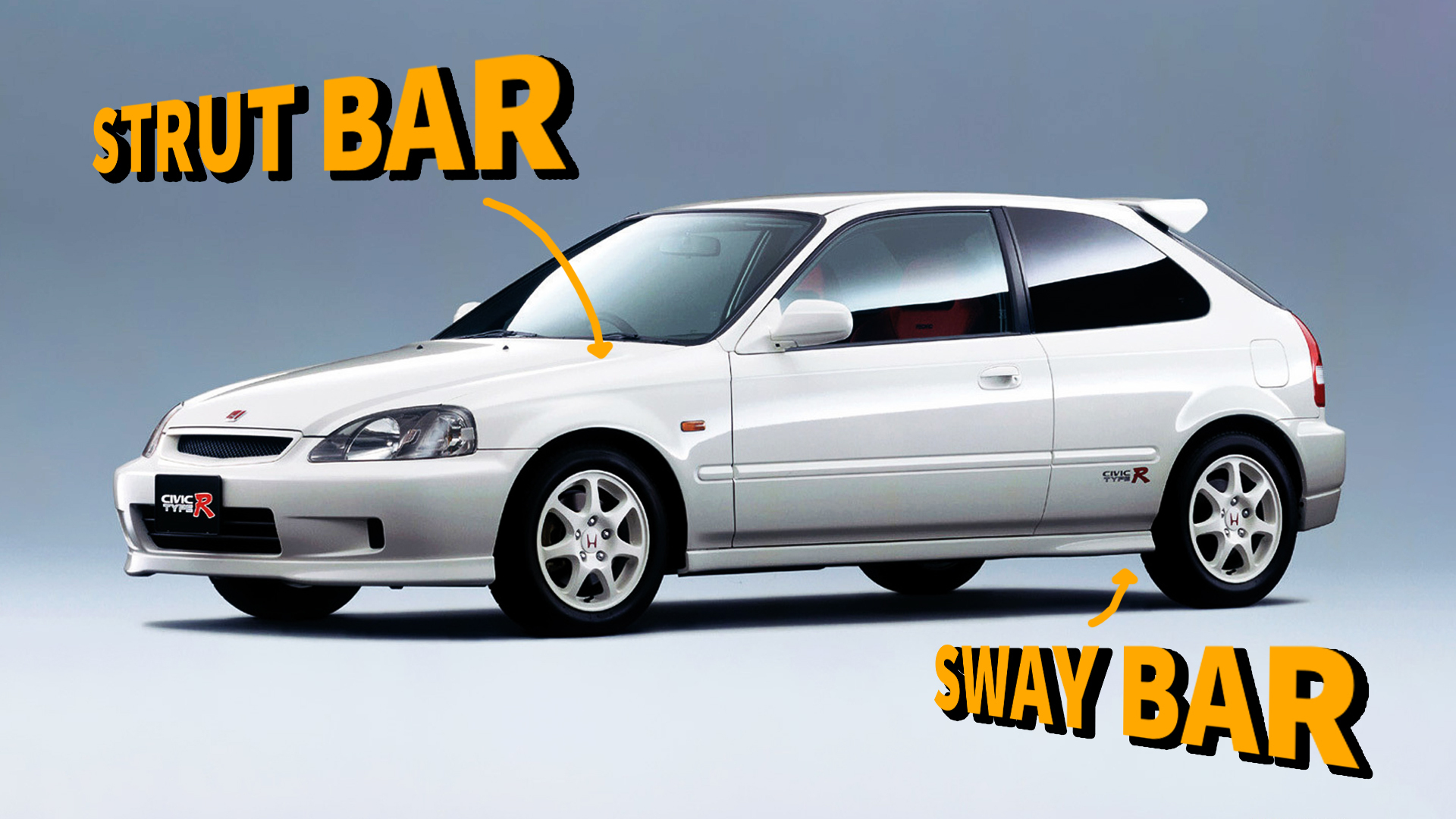 We’ve explained roll center, suspension geometry correction bushings, the benefits of camber, and what sway bars do to a car’s dynamic whole. We touched briefly on body rigidity when we talked about subframe locking collars, but haven’t truly explained the distinction between suspension stiffness and body shell stiffness. For that, let’s look into the difference between a strut bar and a sway bar.