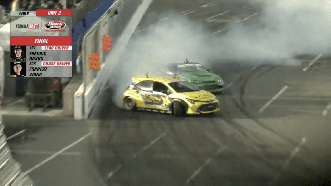 Norwegian Fredric Aasbo keeps Formula Drift returner Forrest Wang at bay to grab first place overall.