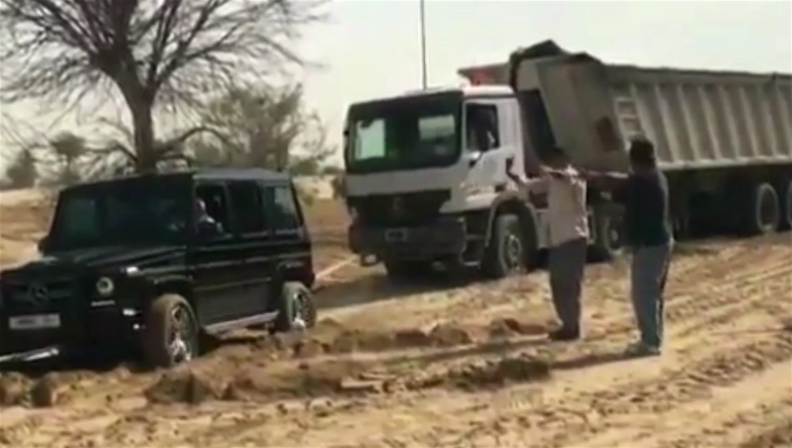 Watch a Dubai Prince Use a Mercedes-Benz G-Wagen to Tow a Truck From the Sand
