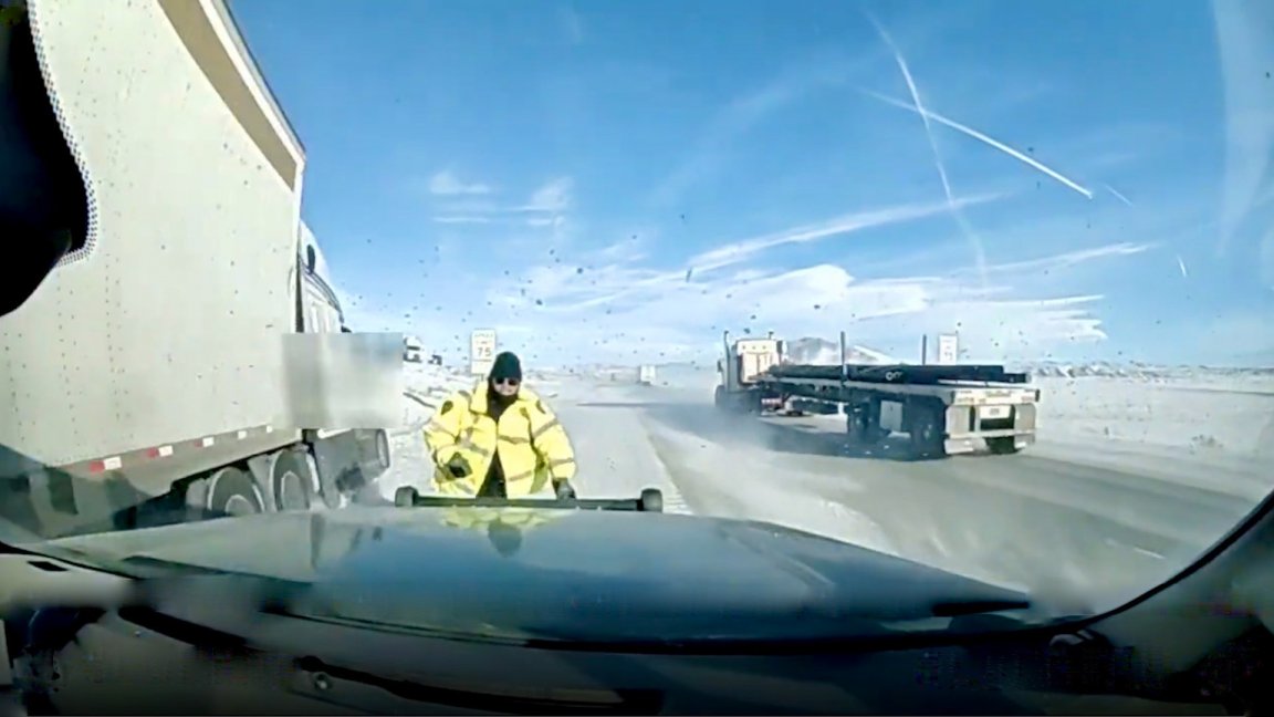 Watch a State Trooper Jump at Very Last Second to Avoid Out-of-Control Semi Truck