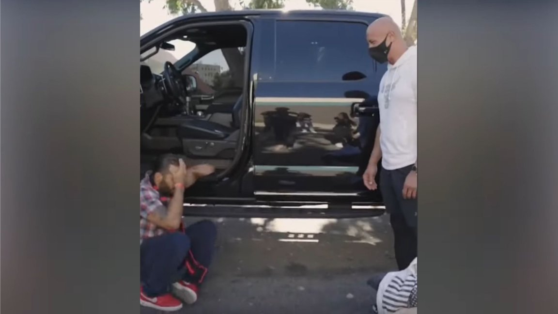 Johnson had planned to give away the Porsche Taycan he drove in the new movie Red Notice but that didn't work out, so his own truck became the gift.
