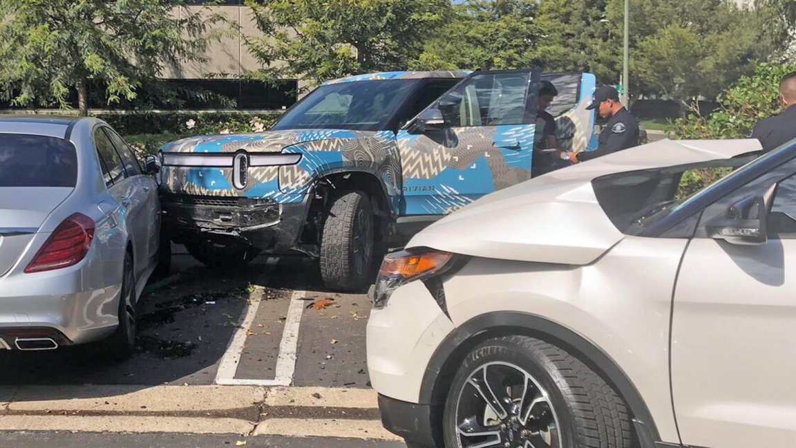 A prototype Rivian R1T left the road and struck two parked cars in California on Wednesday in what appears to be the electric truck's first public crash.