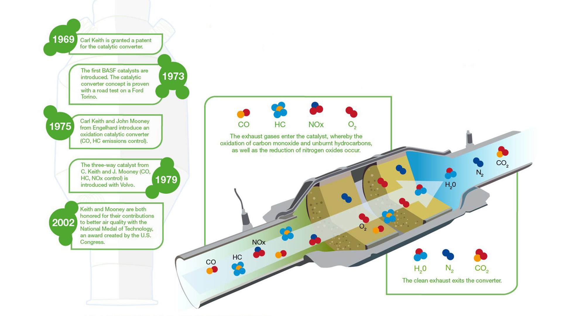 The inside of a catalytic converter contains a metal or ceramic substrate, or a surface on which chemical reactions occur. The substrate is covered in precious metals such as platinum, palladium. and rhodium. With the correct level of heat, the hydrocarbons, carbon monoxide, and nitrous oxides pass over and through the substrate, react with the precious metals, and are converted into less harmful gasses that exit through the muffler and exhaust pipe.