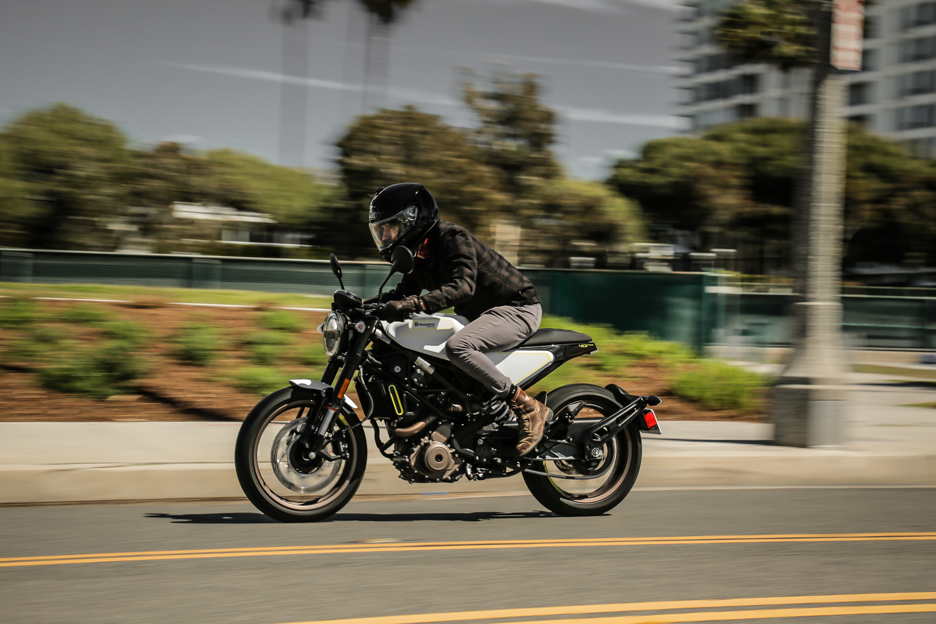 , The Husqvarna 401 Vitpilen is ready for racing through the mean streets of Los Angeles. , Sam BendallBoth bikes are essentially the same from a performance perspective. Each carry the 43-horsepower, 375cc single made popular in the KTM 390 Duke. The Vitpilen comes in four pounds lighter than the Svartpilen, but the difference is negligible.