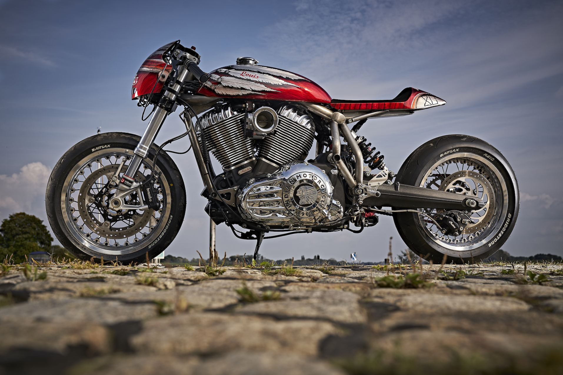 Just about everything on Engina is completely different from a stock Chief Vintage. It has a custom tank, seat, and front cowl with a red and white paint job with feathers reminiscent of the Indian headdress logo. The name “Louis” is painted on the tank and the cowl as some light branding for Detlev Louis Motorrad.