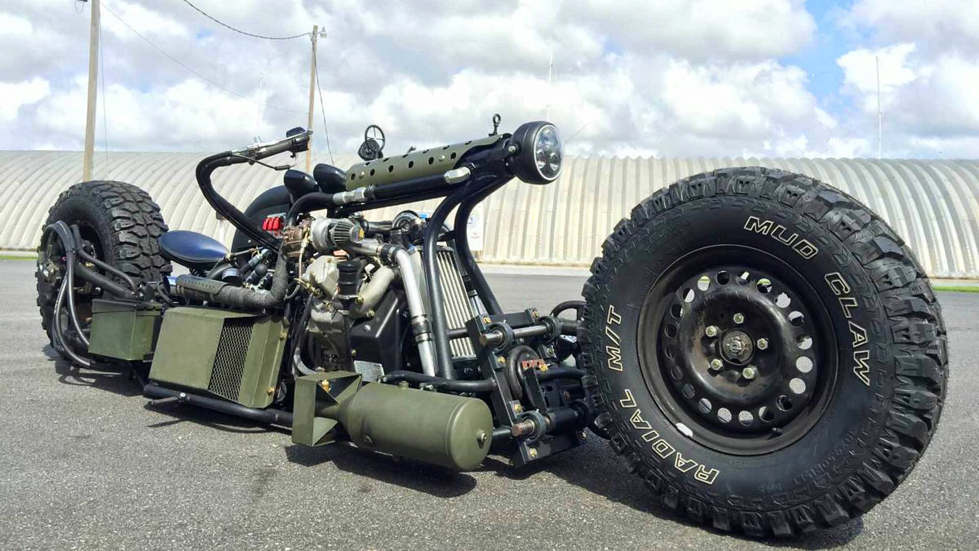 A few other custom touches include wheels from a Toyota Camry, a jerry can fuel tank, an ammo box for the battery, an even a P-trap from a kitchen sink to connect one of the turbos to the engine.
