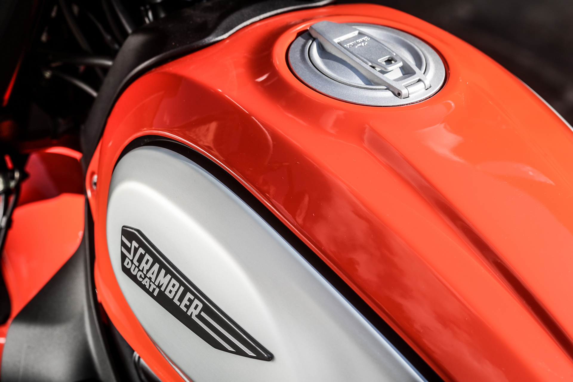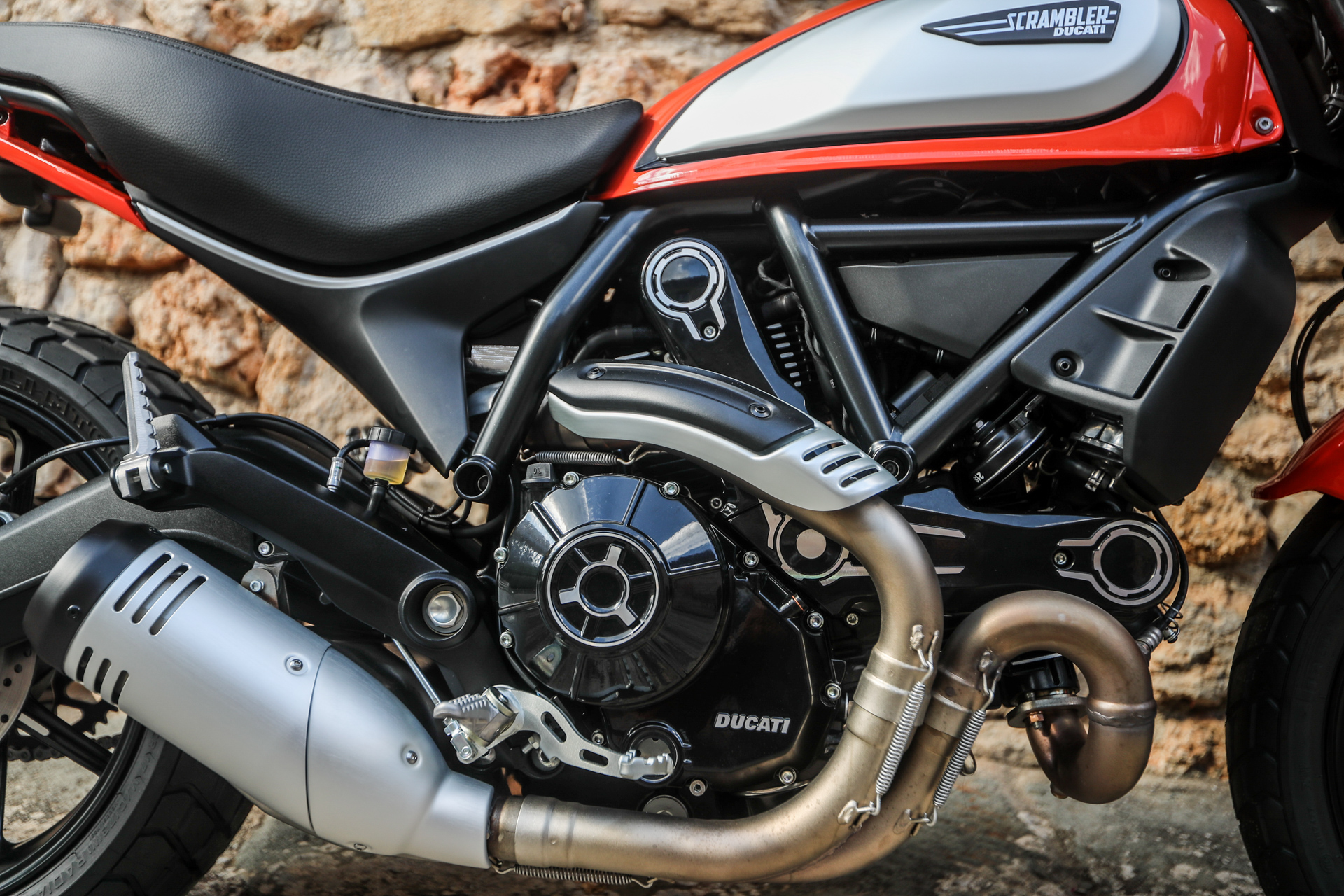 , The 803cc Desmodromic air-cooled L-twin is tried and tested but you will notice the heat coming off of it on warmer days. The high pipe doesn’t help matters either but it looks really cool. , DucatiNew Lights, New Seat, New Look