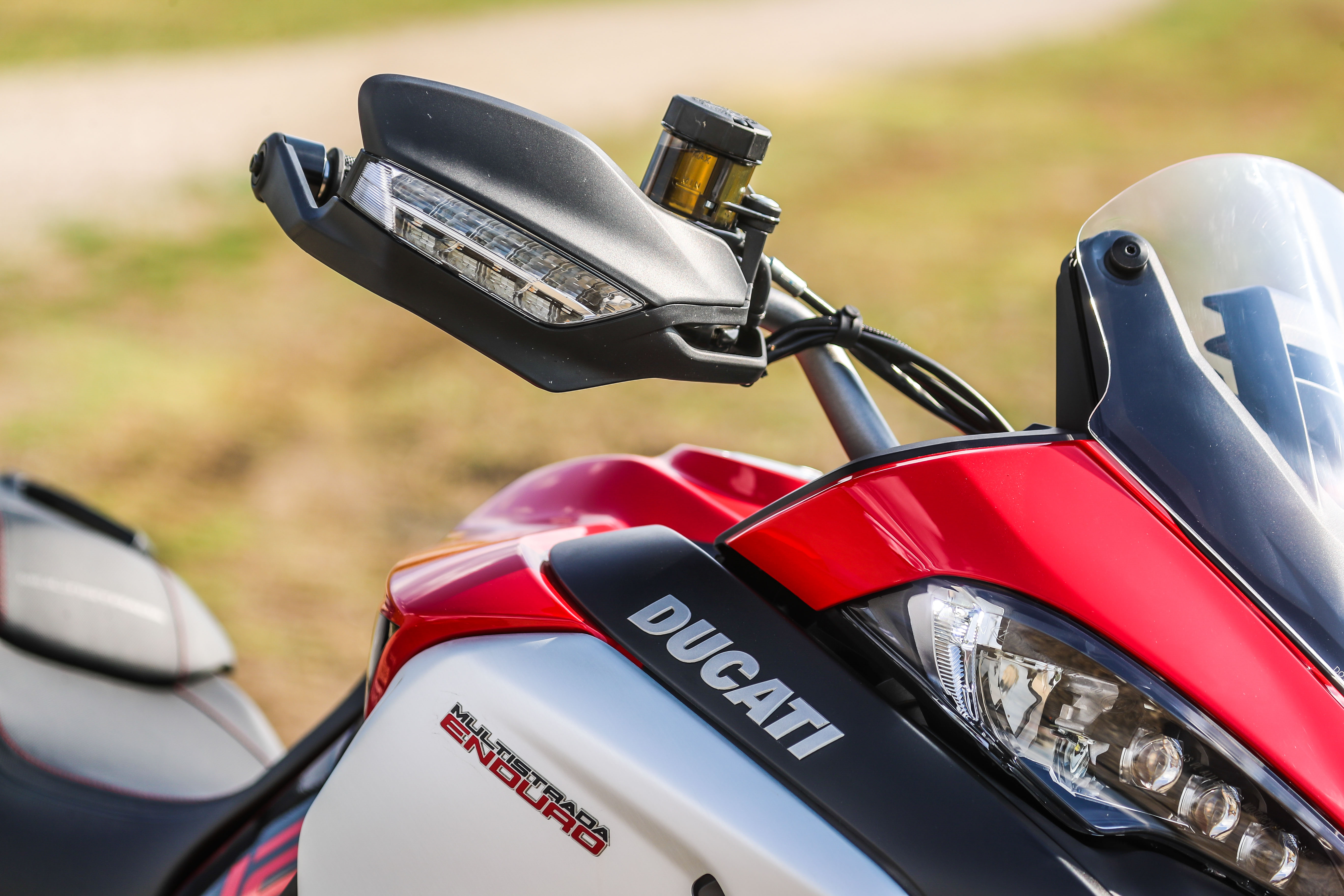 Walking up the Multistrada 1260 Enduro one will notice the front turn signals are integrated into the plastic hand guards. From a design element, it allows the front of the bike to maintain very clean lines and it does look great. But they’re also flimsy, and anyone who has ever ridden a dirt bike knows that falling now and again is just part of the game. Sadly, we cannot all be badass off-road legends like Beppe Gualini, 65-time participant of the Africa Rally Raid and Ducati’s DRE Technical Director. One drop, and the stock handguards are toast.