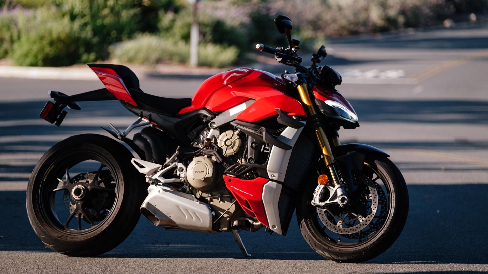 Pirelli’s super-sticky Diablo Rosso Corsa II tires are shoehorned onto forged aluminum Marchesini wheels. A fully adjustable Öhlins suspension is featured front and rear, with a longer single-sided aluminum swingarm compared to the Panigale to try and keep the Streetfighter V4S’ nose touching pavement. It’s a losing battle, though, even with Ducati’s Wheelie and Traction control settings on high—physics, you just can’t beat it.