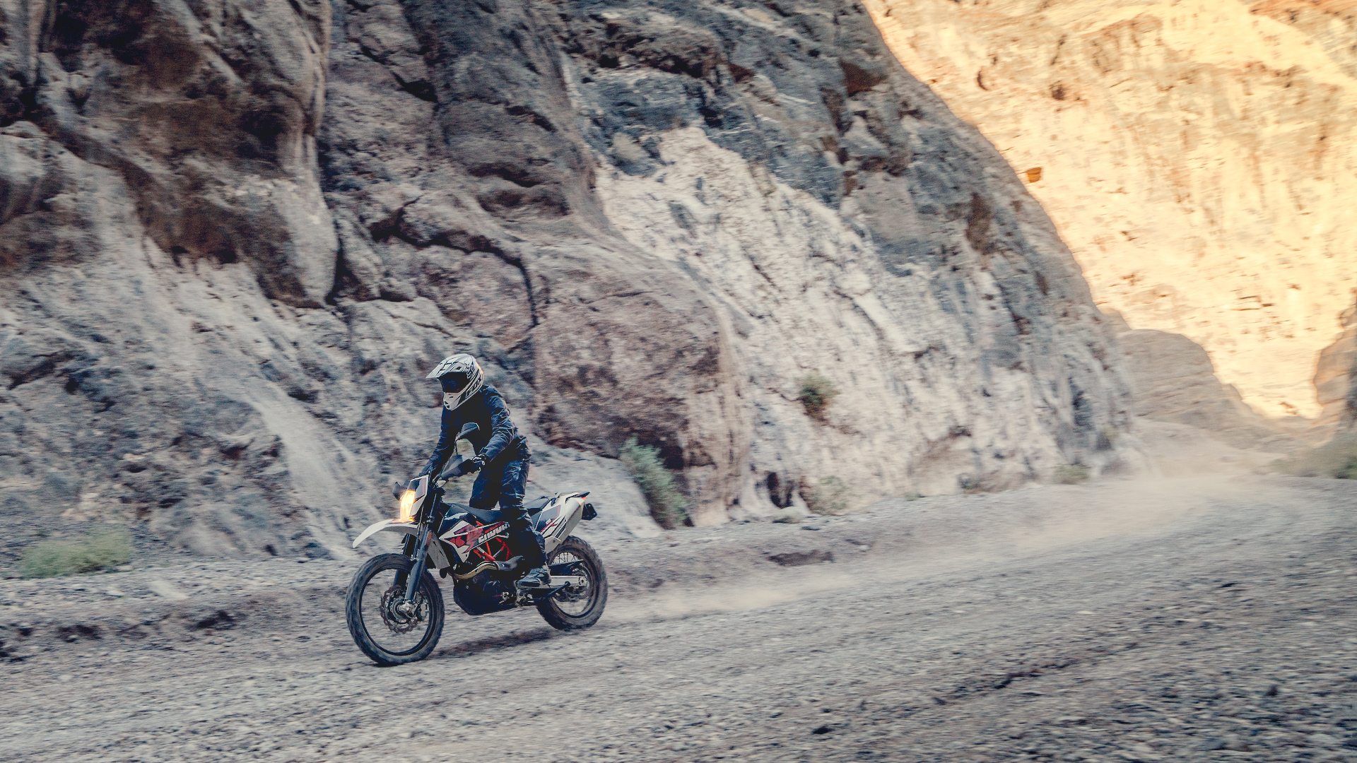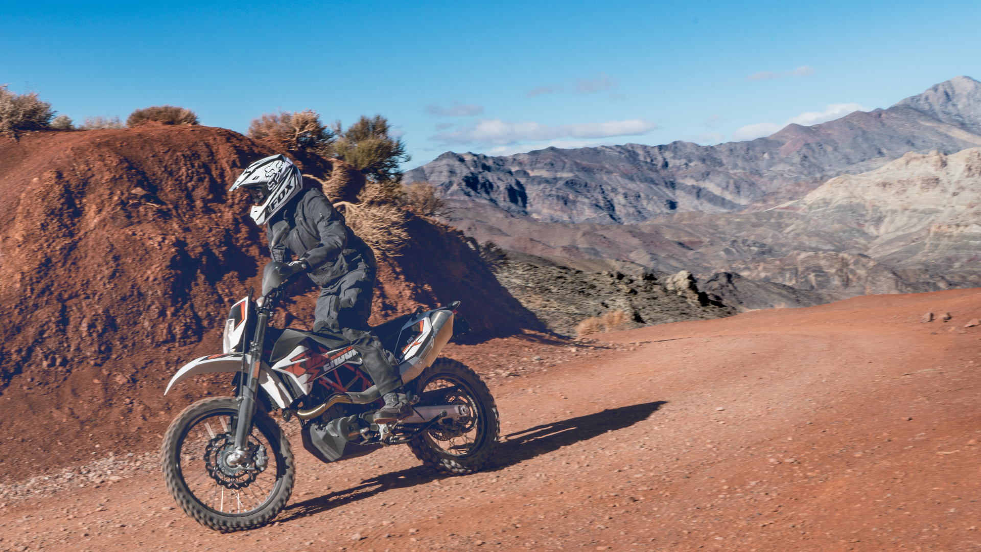 On road, the big KTM takes no getting accustomed to. Dirt bikes, especially big single-cylinder machines like the Enduro R, are often overlooked by sport riders. But all the requisite parts are there. A stiff trellis frame, purposeful suspension and a rudely torque-y motor. Taken together, it could be the description of a sport bike—and it’s everything you want in the twisties. Truth be told, there’s nothing I’d rather hustle down a paved canyon. In this deep gravel and with my off-road inexperience, though, the big KTM has me busy. The bike will turn—I’ve seen it happen, goddamit! More able riders can rail on a 690 Enduro, but for the life of me I can’t get it pointed the right way unless I’m pouring on the throttle—which means a whoosh of eye-popping speed. Which means anxiety. Because a dirt bike with just a hair under 700 cc’s of displacement does speed like few things in this world.