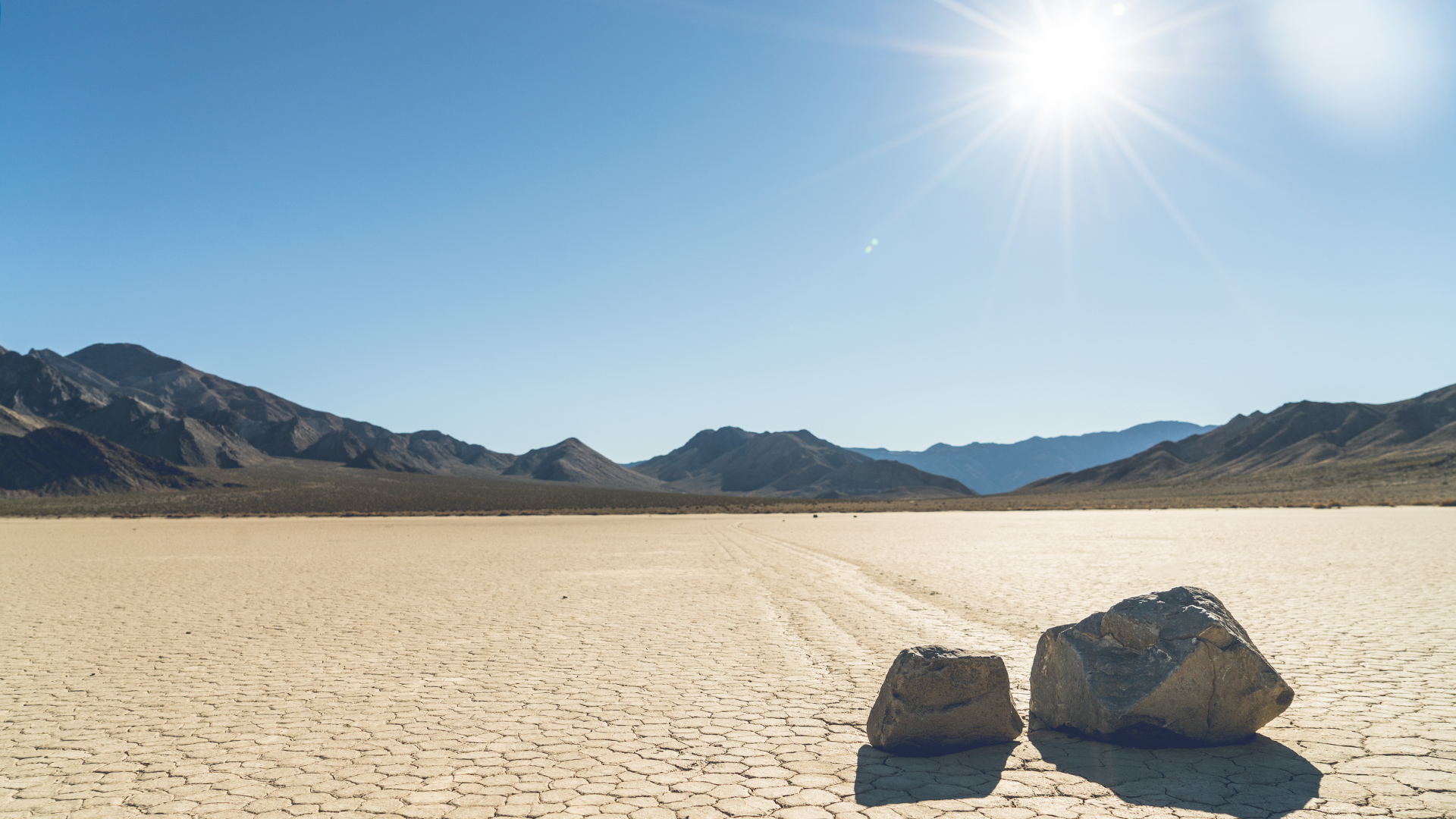 Titus Canyon leads to the desert floor. To the south is Furnace Creek and Badwater. The lowest point in the US, where rainwater collects every crystal of salt and condenses in the sun, leaving a thick white crust. We turn north, toward the vast Ubehebe Crater, and from there, the Racetrack Playa. Beautiful and weird and spooky, the Playa is home to a strange and unsettling natural curiosity: Rocks that move across the desert of their own accord. Their paths are illuminated by scars in the perfectly flat and dry lakebed surface.