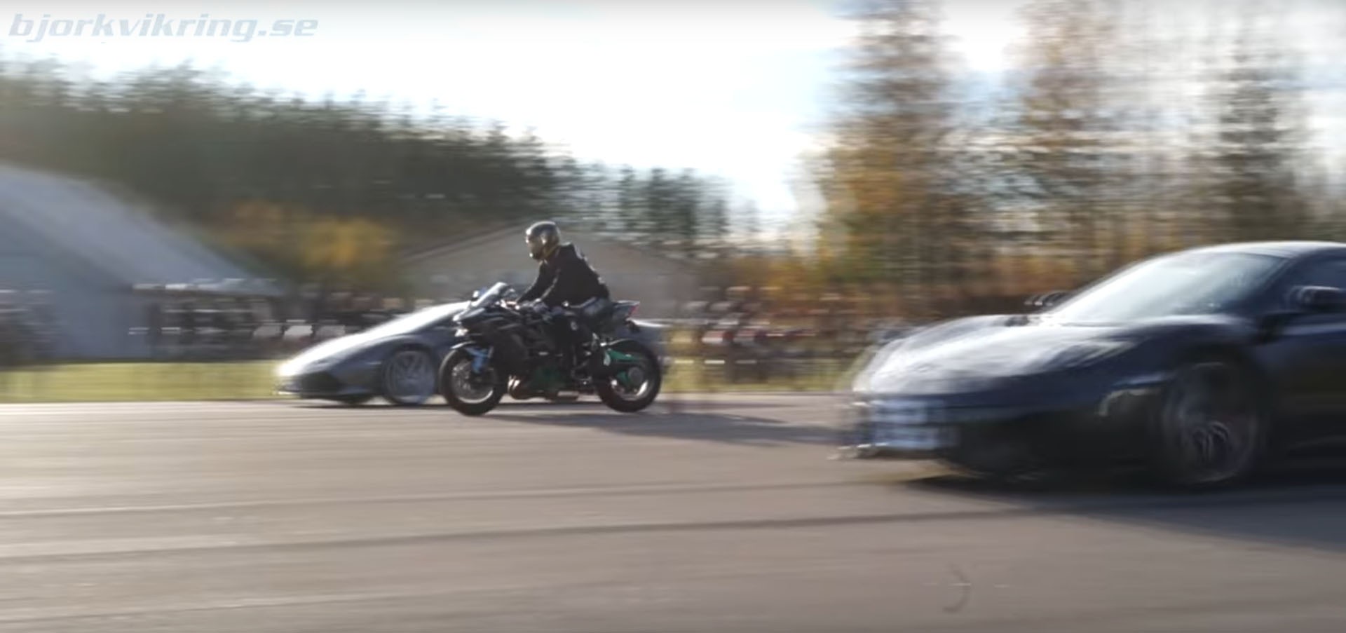 But maybe those numbers don’t seem impressive enough. Or maybe you’d just like some more context. Either way, a good ol’ fashion bike-versus-supercar drag race can help. The video below demonstrates the results of a rolling runway pull between an H2, Lamborghini Huracán LP610-4 and McLaren MP4-12C Spider. The latter car, according to its owner, has been modified to the tune of 720 horsepower.
