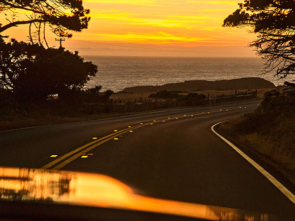 Sunset on Highway 1. One thing about this road: You don’t see a lot of fuel stations. The Charger gets as thirsty as its driver after a long day (15 mpg city / 25 mpg highway). We’ll admit to a hint of anxiety when the fuel-gauge warning blipped on in the middle of nowhere—until we found a 76 in the village of Gualala.