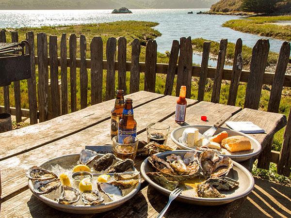 [Drive from Navarro Vineyards to Hog Island Oyster Farm: South on 128 to 101 south, right on Tomales Road to Highway 1 south, which becomes Shoreline Highway. The farm is #20215. Drive time: 2 hours.]