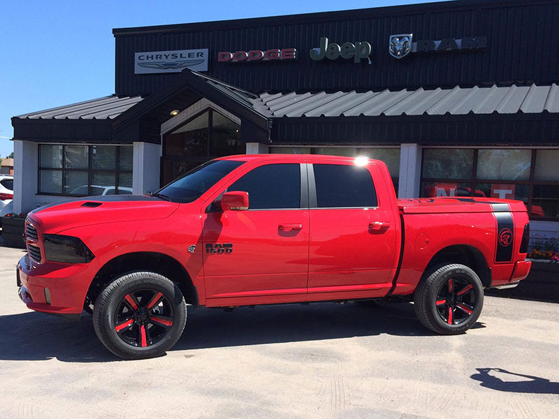 The truck, which we first found through SRTLIFE, is a Ram 1500 with smoked headlights, Hellcat badges, black-and-red-painted wheels, a cold-air intake, and, of course, that mental, supercharged 6.2-liter Hellcat V8. The truck was built by Midland Dodge in Ontario, Canada, at the request of a customer. On Facebook, the dealership notes they plant to install a carbon-fiber driveshaft and a lowering kit as well. From the pics, the build looks incredibly clean, and the engine appears to fit almost perfectly under the hood of the truck.