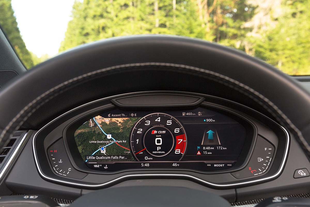 The clearest proof of this lies dead ahead of the driver in the instrument panel, where SQ5s equipped with navigation have the Virtual Cockpit—an adaptive 12.3-inch display that can toggle between different modes. The SQ5 receives a Sport mode for the instrument panel, which provide a big Ferrari-style “analog” tach front and center with a digital speedo set inside and a pair of secondary info panels flanking it; it may be my favorite of the current batch of all-digital IPs on the new car market.
