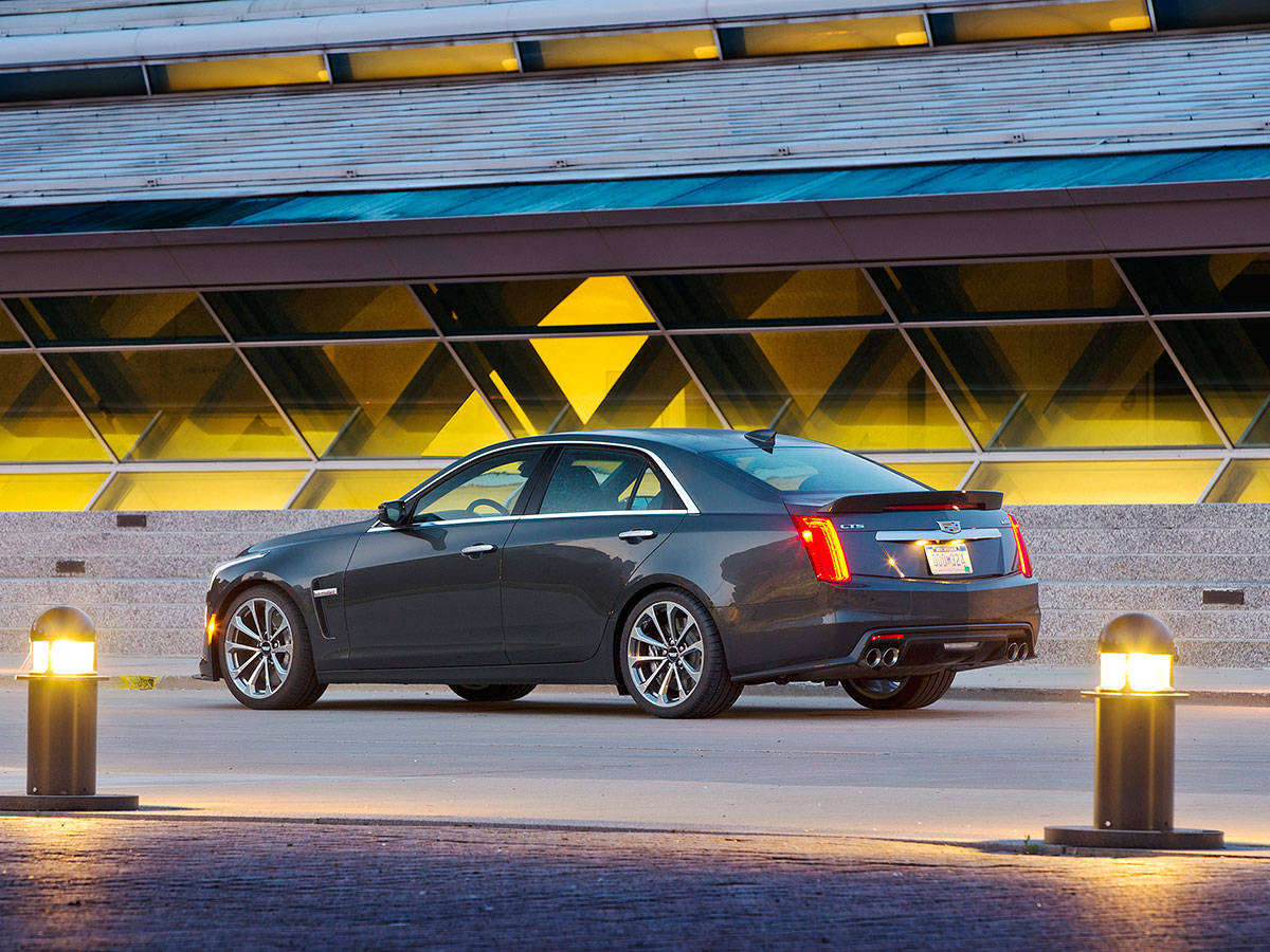 Of course it’s fun, as a Sedan deVille with a 6.2-liter Corvette Z06 motor should be. And the Caddy is no parade float, but a virtual sports car with bonus doors. The chassis is hyper-engineered for stiffness, cooling and aero goodness. Caddy’s latest, driver-adjustable magnetic shocks deliver 40 percent faster damping. In tandem with a five-mode electronic limited-slip differential, the CTS-V can play the good Dr. Jekyll or go full-on Hyde. Brembo brakes, including six-caliper, 15.4-inch rotors up front, haul the Cadillac back to civil speeds, even during a frenzied dalliance with the car last summer at Wisconsin’s Road America, where I saw 150 mph on the long straight.