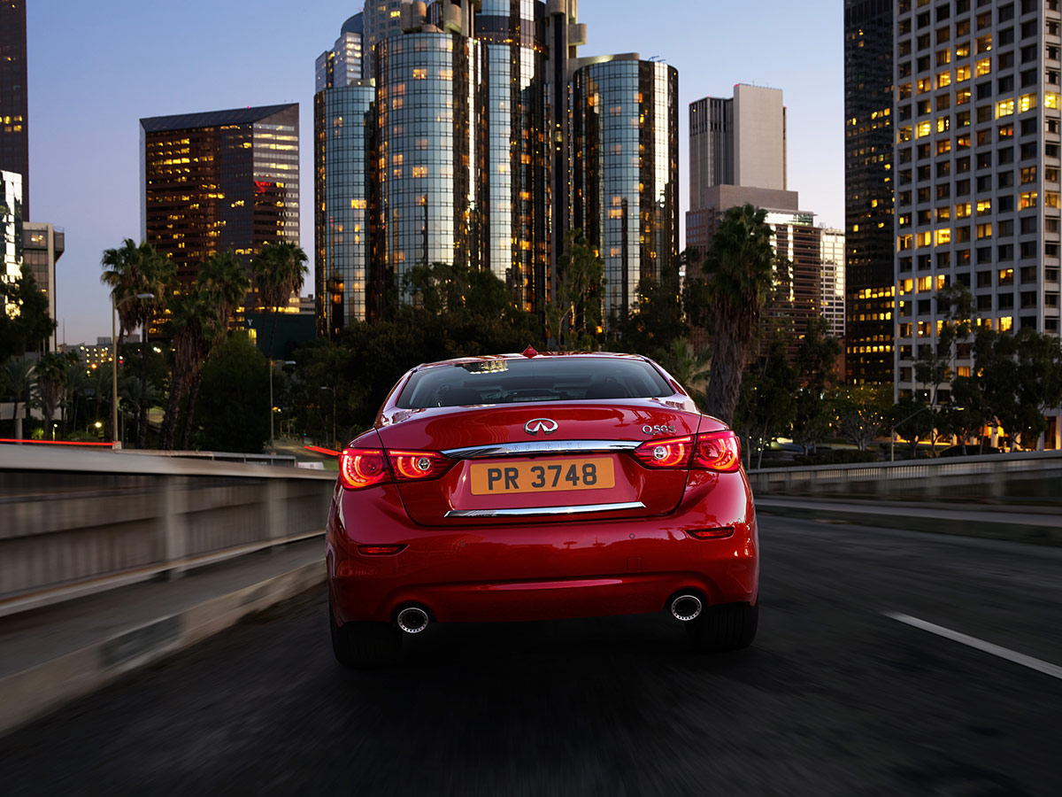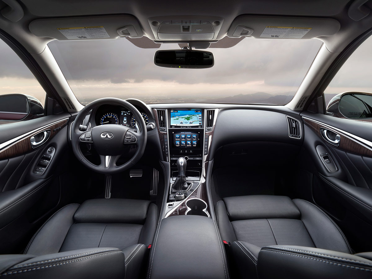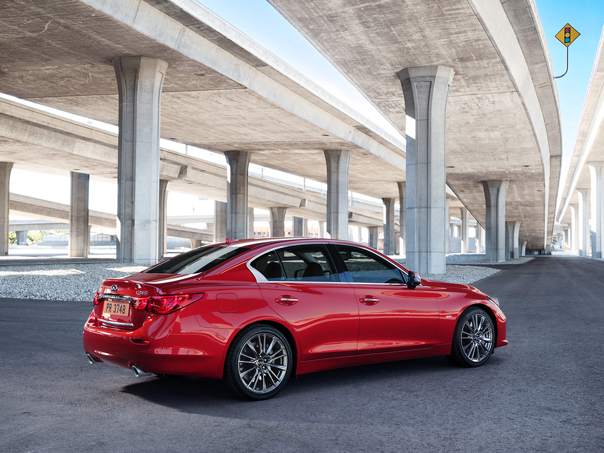 Beyond the Red Sport trim, the 2016 Q50 offers three other engine choices: a de-tuned V6 with 300 hp and 295 lb-ft.; a hybrid, which uses Infiniti’s old 3.5-liter V6; and an entry-level 2-liter turbocharged four-cylinder, which is sourced by Mercedes. That last engine, derived from the Mercedes-Benz CLA250, is rated at a modest 208 hp and 258 lb-ft. All Q50 models will only be offered with a seven-speed automatic transmission.