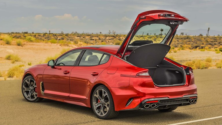 For a base price below $33,000, the Stinger brings a 2.0-liter, twin-scroll turbo four with 255 horsepower and 265 pound-feet. It’s good for a respectable 5.9-second jaunt from 0-60 mph. But for a shade under $40,000 to start, the Stinger GT is especially eager to stick it to the lofty Germans: a twin-turbo, 3.3-liter V6 generates 365 horsepower and 376 pound-feet of ready, steady torque. The upshot is more horsepower and torque than an Audi A5, S5, and A7; a BMW 440i or 640i; or Porsche Panamera V6. Oh, and a higher top speed—167 mph, in a Kia!—than any car in its ostensible class, including models that cost tens of thousands of dollars more. The Stinger’s 4.7-second hustle to 60 mph also bests a half-dozen competitors, from BMW to Infiniti, trailing only the Audi S5 Sportback’s 4.5-second run. The Porsche Panamera V6, which starts above $85,000, is a full second slower to 60 mph.