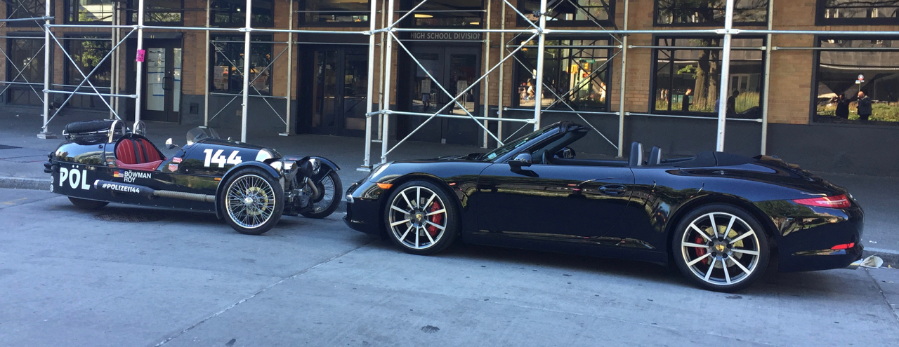 This week on Morgan Versus, the world’s best/worst car — my Morgan 3-wheeler — faces off with Germany’s best. Maybe not their absolute best. But a pretty good one: a 201x Porsche 911 Carrera S Cabriolet. What year is the Porsche? I forgot. Actually, I didn’t even really check. Does it matter? No. Every Porsche is the best Germany could do in any given year. You can’t say that about British cars. I think this 911 is a 2013. Guess what?