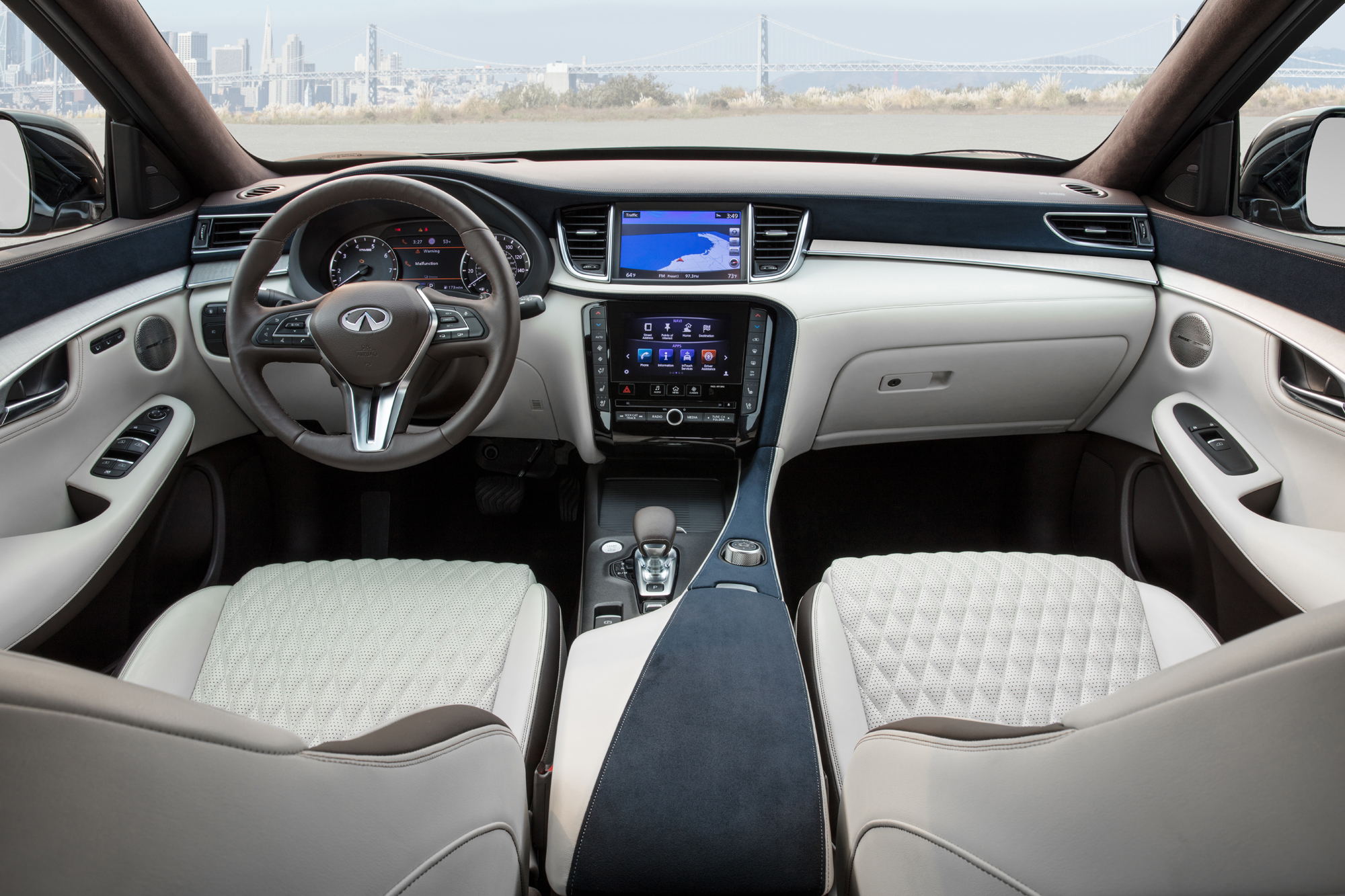 A new suspension setup includes MacPherson struts all around, with active, floating-valve-type dampers. The QX50 also gets a a specially tuned version of Infiniti’s Direct Adaptive Steering, the first front-wheel-drive application of the system, or a standard electric power steering rack.