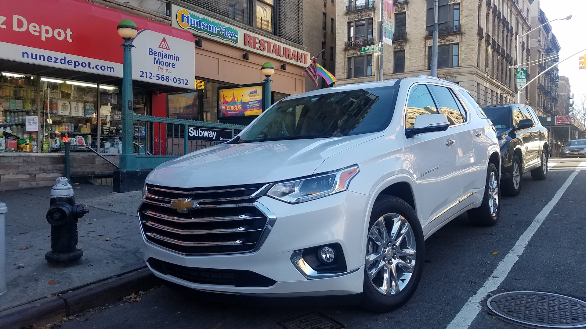 What I didn’t expect—but maybe should have, considering evidence like the Camaro, Corvette or even the Volt and Bolt—was how smartly the Chevy steered and handled. Even with its lightened body, the AWD Traverse can top 4,600 pounds. Yet the handling could fairly be described as “sporty,” at least by sumo-wrestler terms. The Traverse’s body stays remarkably flat through curves, with none of the wallow or roll you might expect in such a big beast. Brakes are strong, with good pedal feedback. I’d actually love to see this Chevy tackle an autocross course—okay, an extra-wide autocross course—against haughtier three-row competition, such as the Land Rover Discovery or Mercedes GLS-Class. Because I think the Chevy would win. Move to public roads, and the Traverse will keep pace with smaller, sportier SUVs. On the fast-paced, serpentine Saw Mill Parkway north of Manhattan, a guy shot past me in a BMW X5, likely figuring he’d seen the last of me. Nothing doing: Up and over a blind uphill curve, I walked around his X5 at nearly triple-digit speed. [If anyone from the Westchester County Sheriff’s Department is reading this, he’s totally exaggerating. Heh, heh. —Ed.] And while the BMW driver definitely blinked, the Chevy never bobbled.
