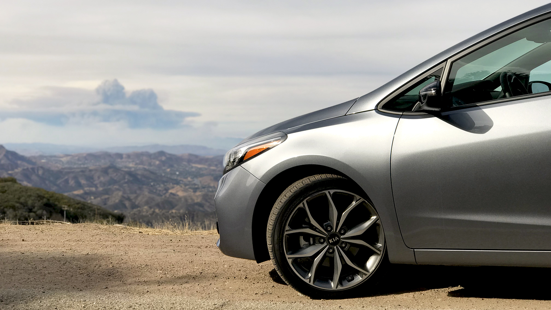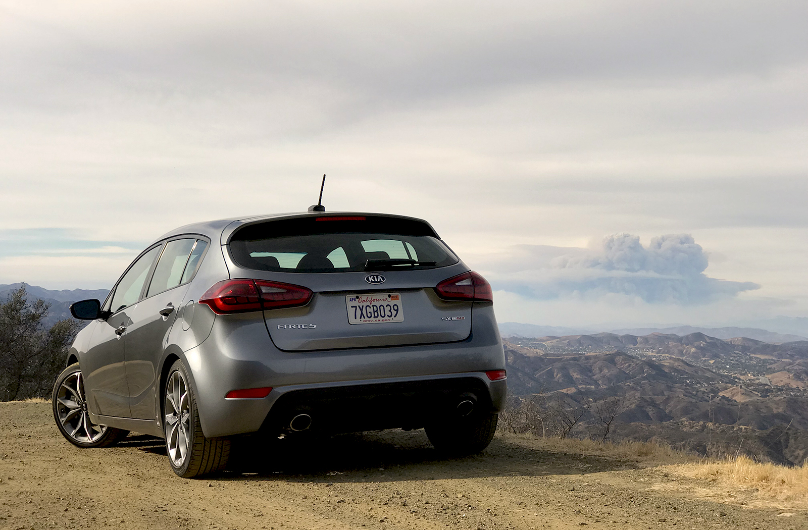 The more I drive, though, the harder it became to outrun reality: This Kia is too soft to be a true hot hatch, too compromised to be considered premium. And as I round a corner with the brakes giving off a telltale squeal, I see it: the Thomas Fire smoke plume, an ashy mushroom cloud towering miles above the horizon. Things always catch up to you in the end.