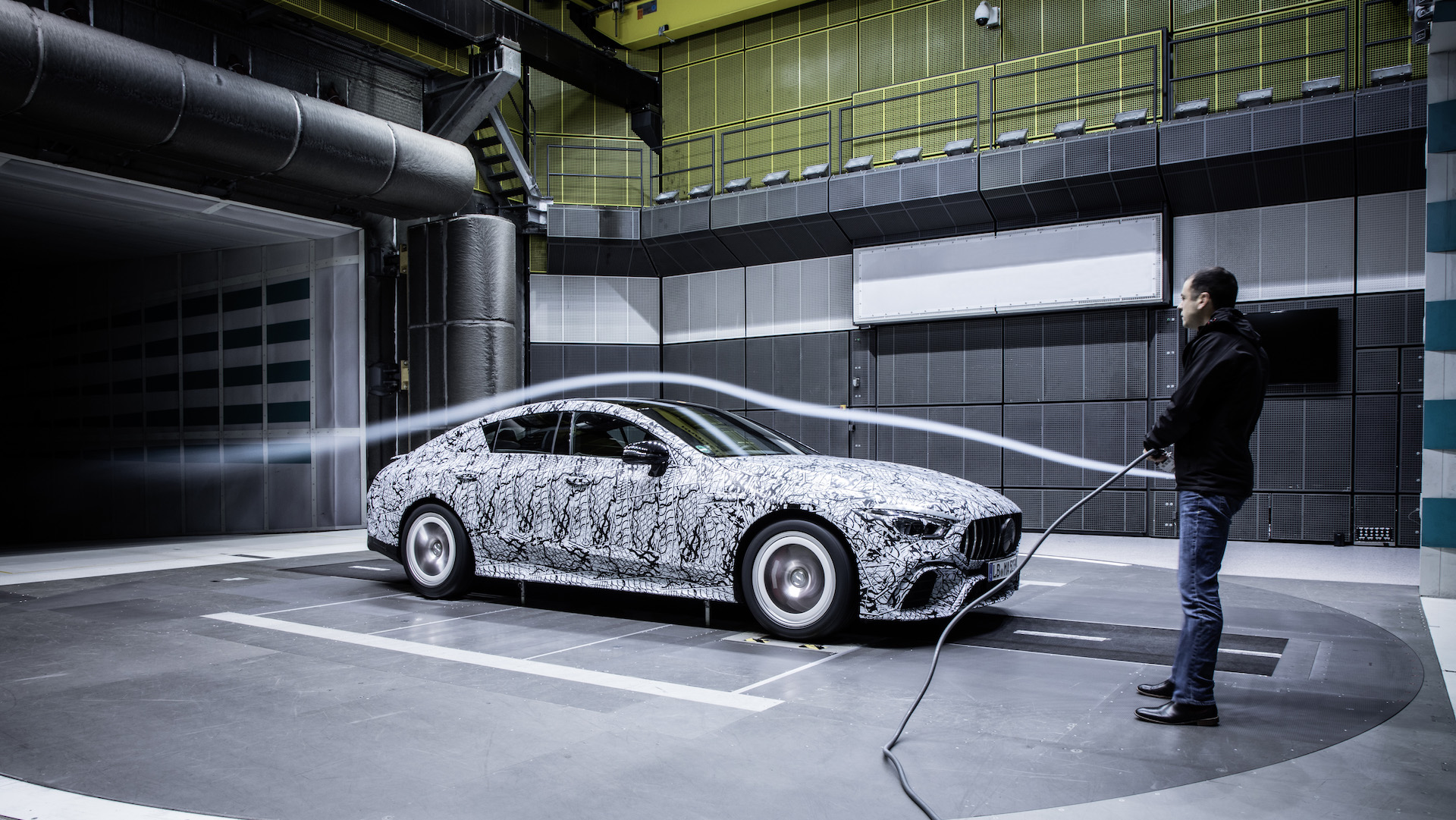 Mercedes-AMG has released another round of teaser photos of its upcoming AMG GT four-door coupe, but unlike the last few snaps that took place on European mountain roads, these were shot inside AMG’s own wind tunnel.