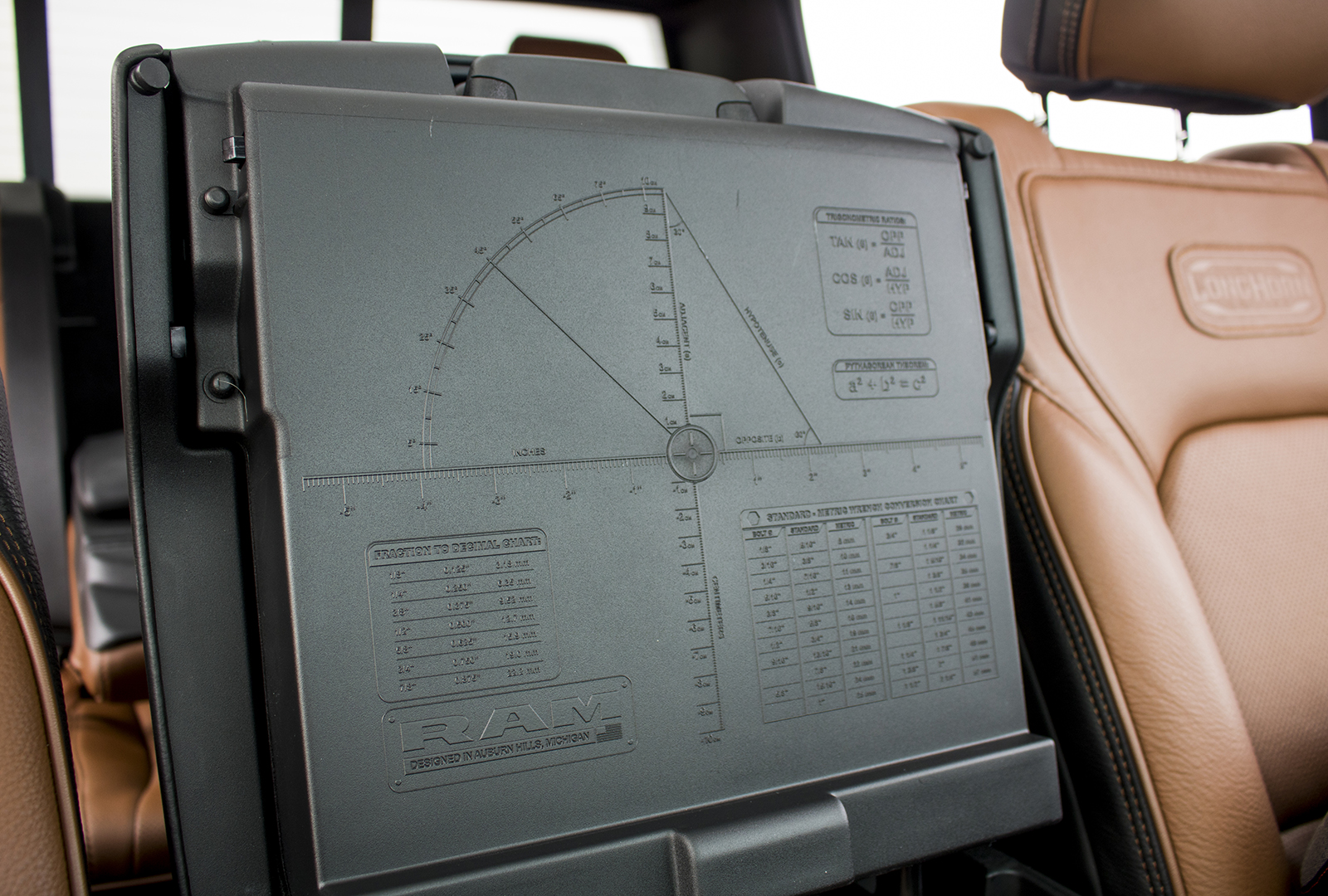 And while it’s deeply unsexy, it’s worth mentioning the ridiculous lengths Ram engineers went to preserving the truck’s 15 mile-per-gallon city/22 highway/17 combined fuel economy figures, despite the optional 33-gallon tank. In addition to implementing start-stop and eight-to-four cylinder deactivation, the team also redesigned the cooling fan so it sucks less power from the engine, and added a thermal exchanger that uses engine heat to warm up the rear axle gear oil to increases efficiency. And the aero tricks extend beyond that—there’s that active front air dam plus grille shutters and an automatic lowering feature at higher speeds on trucks equipped with air suspension.