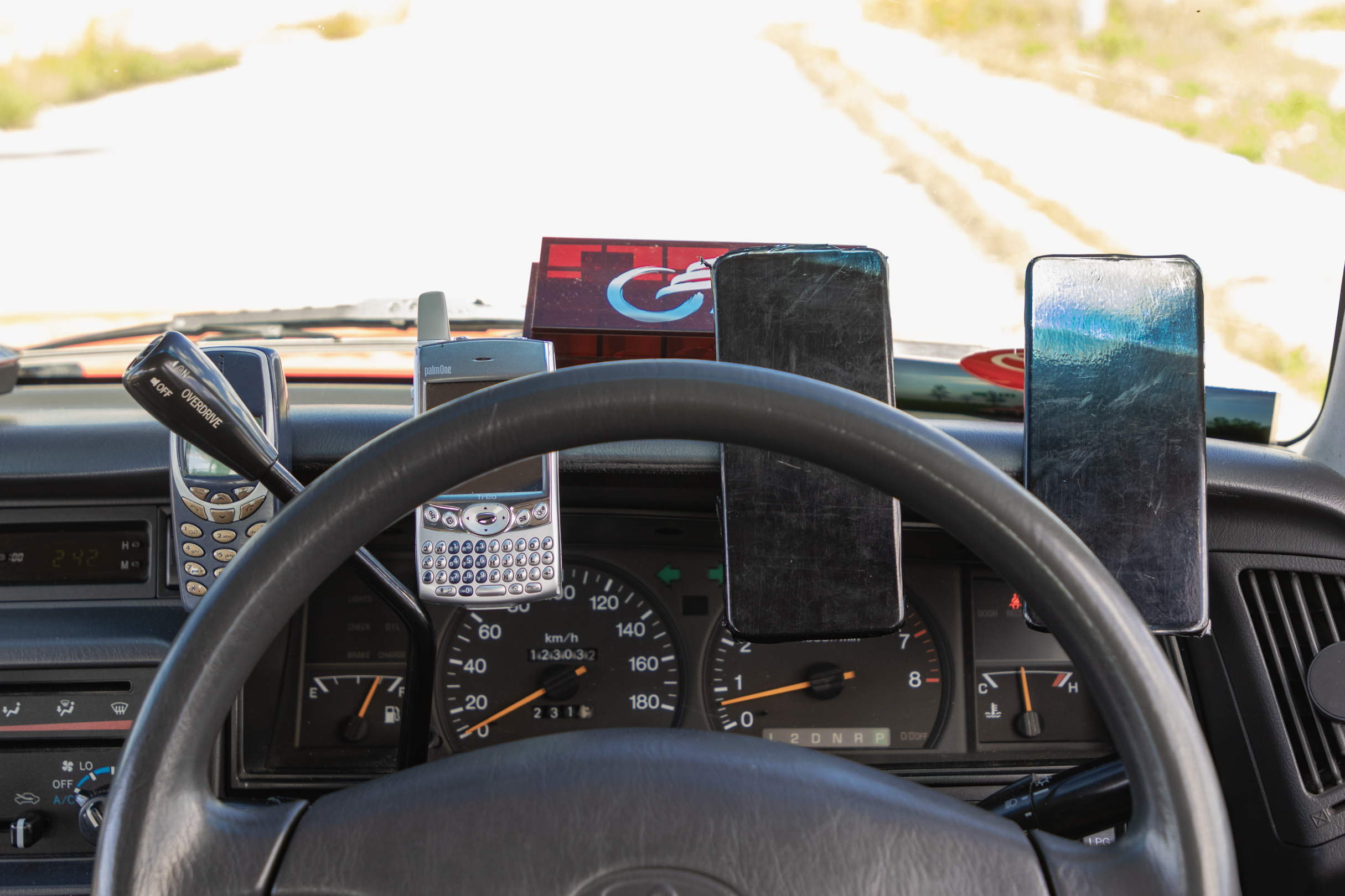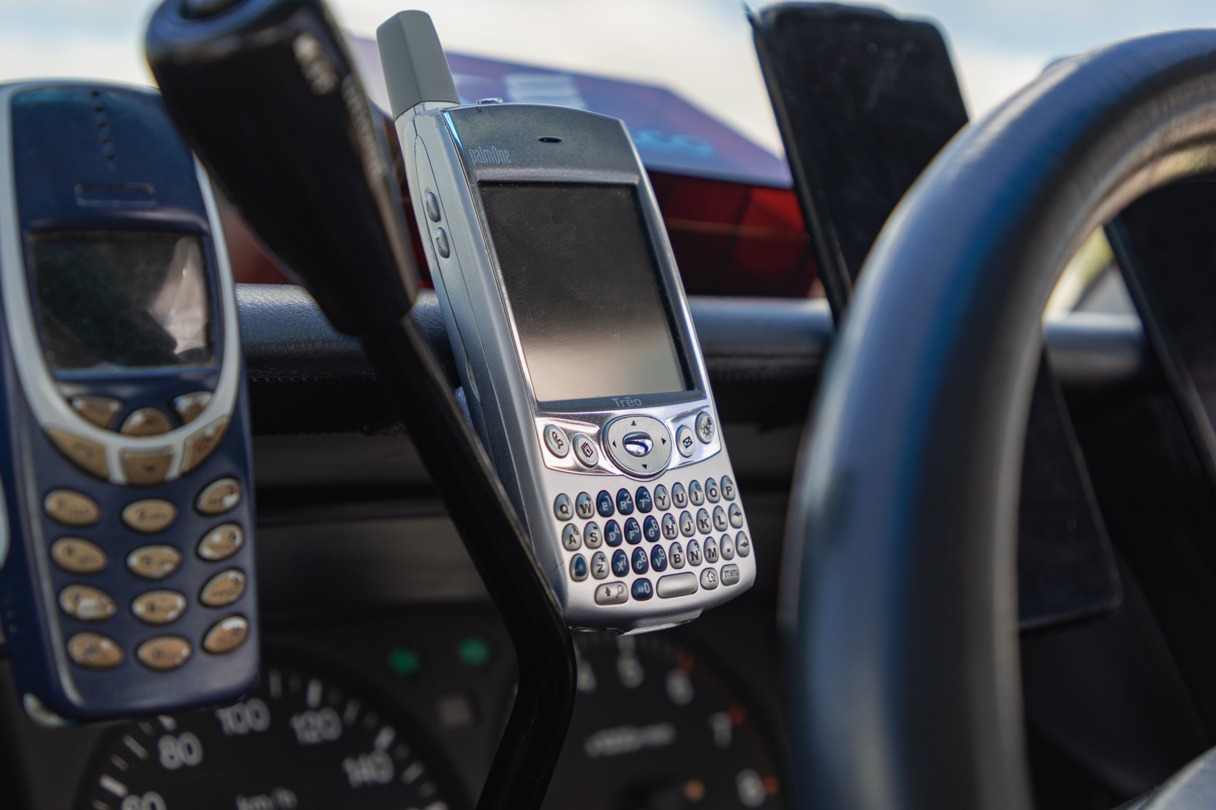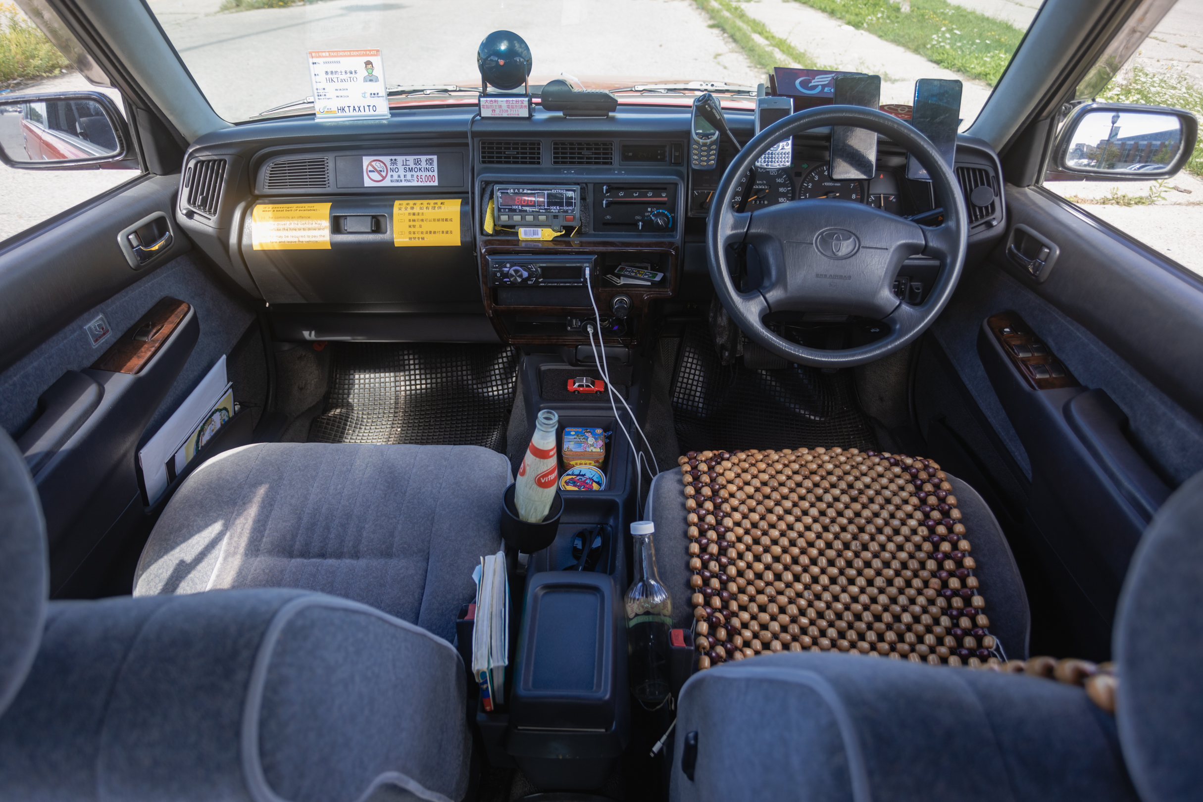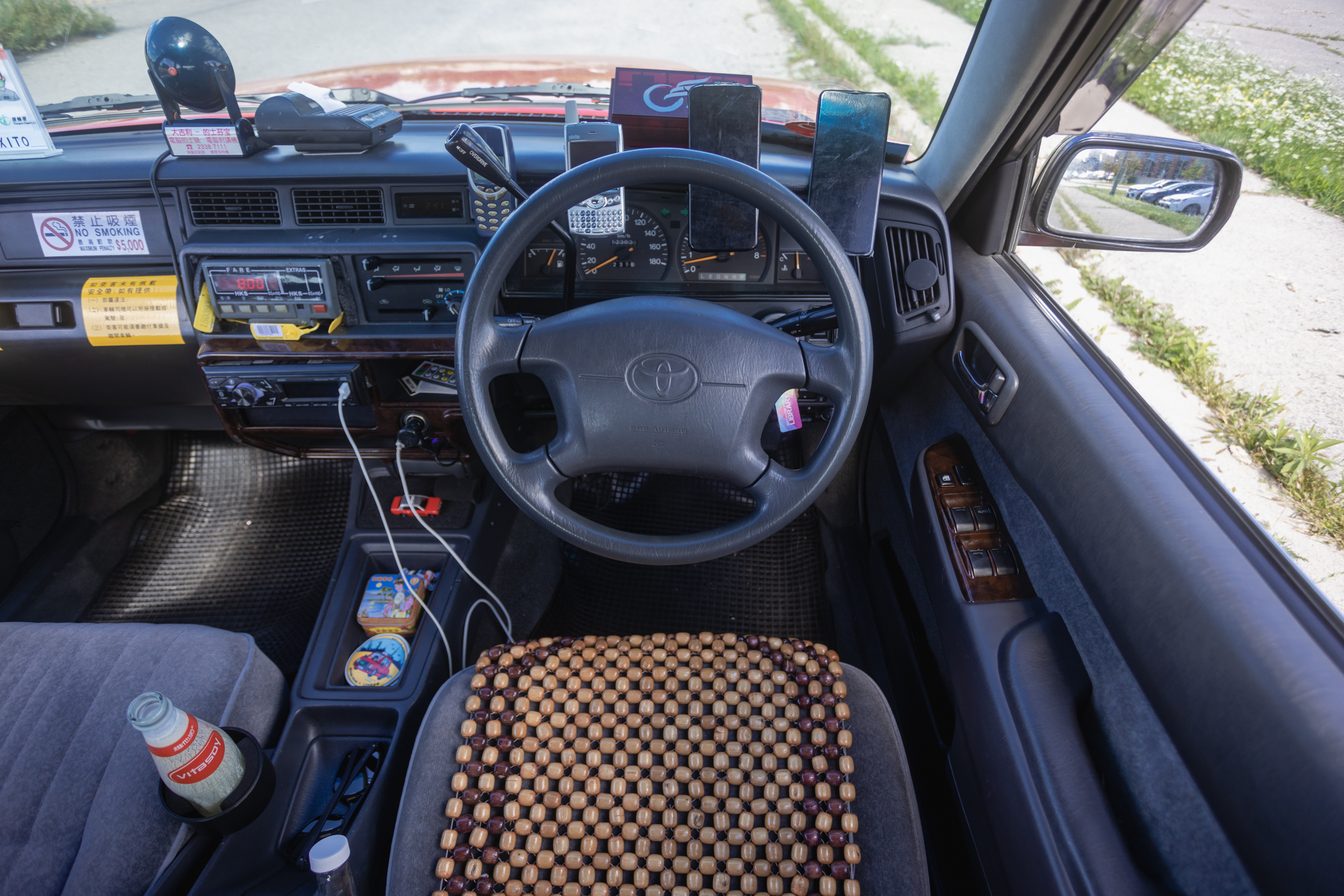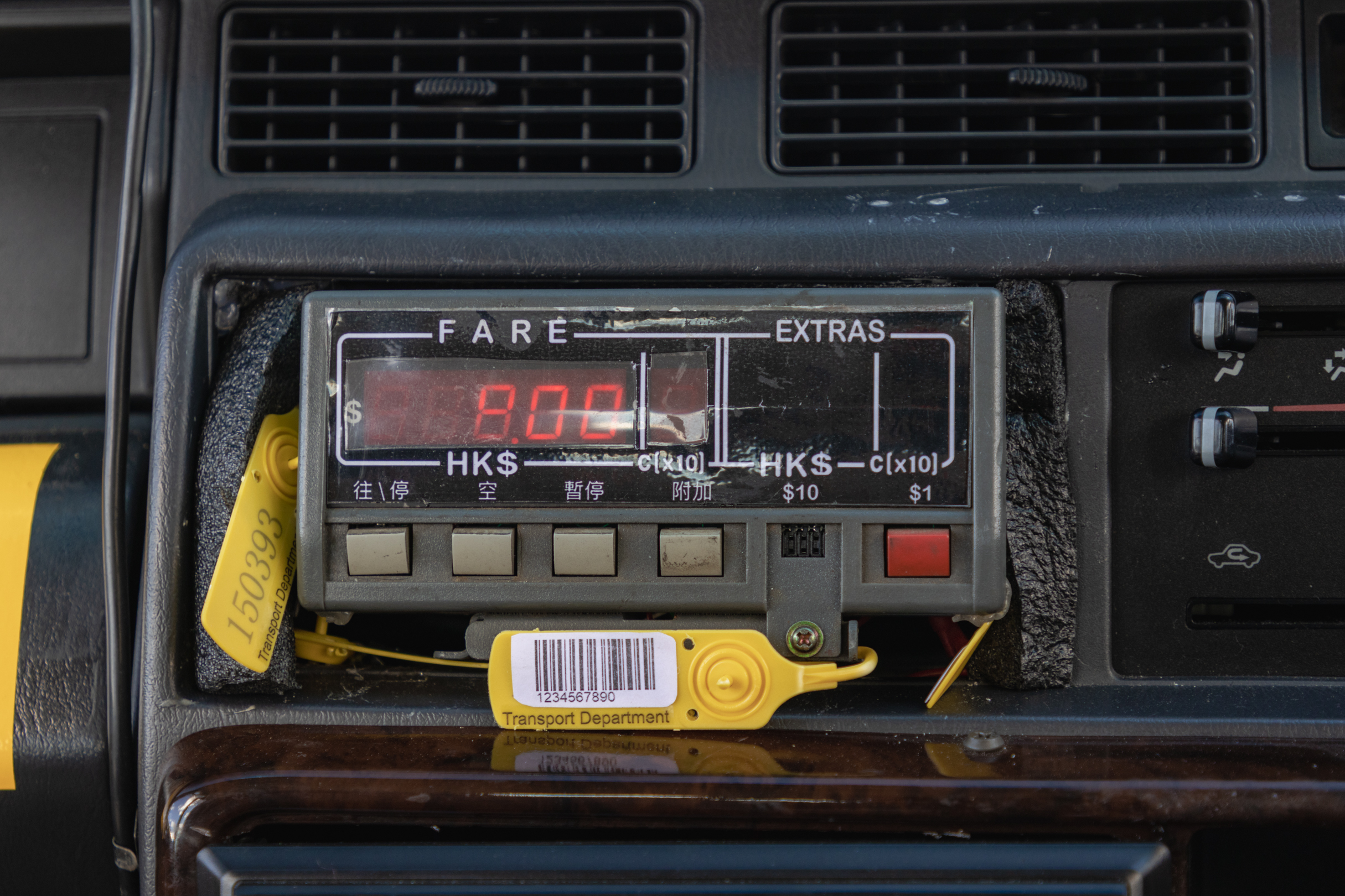 In November 2021, current owner Alan Wu bought it and has spent much of the past year restoring and doing it up, getting it to look as much like the real thing as he can. That means yellow interior stickers in both English and traditional Chinese outlining how much your ride is going to cost and what you are and aren’t allowed to do, a wood-bead cover on the driver’s seat, and that red “TAXI” light that flips up on the dash to let people know whether you’re taking passengers or not. The rooflight actually works. There’s a little device that prints receipts, a red coin box with the word “ECO” printed on it for some reason, and an entire squad of cell phones of varying vintage stuck above the gauge cluster. And the aftermarket audio system was tuned to Chinese talk radio. It really is the full HK taxi experience.