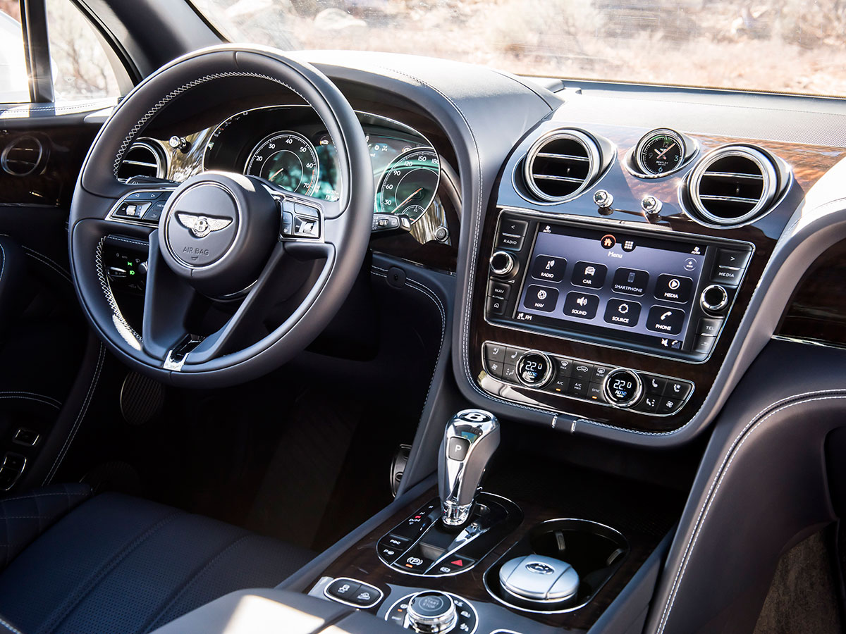Fortunately, the inside is exquisite. Taking Bentley’s winged emblem as inspiration, it cossets five occupants—four, if you’re willing to shell out $11,000 to replace the rear center seat with controls for the heaters, coolers, recliners, and massagers. Fifteen hides and seven veneers are available as standard choices. Seal embryo and endangered Madagascar baobab can probably be commissioned upon request.
