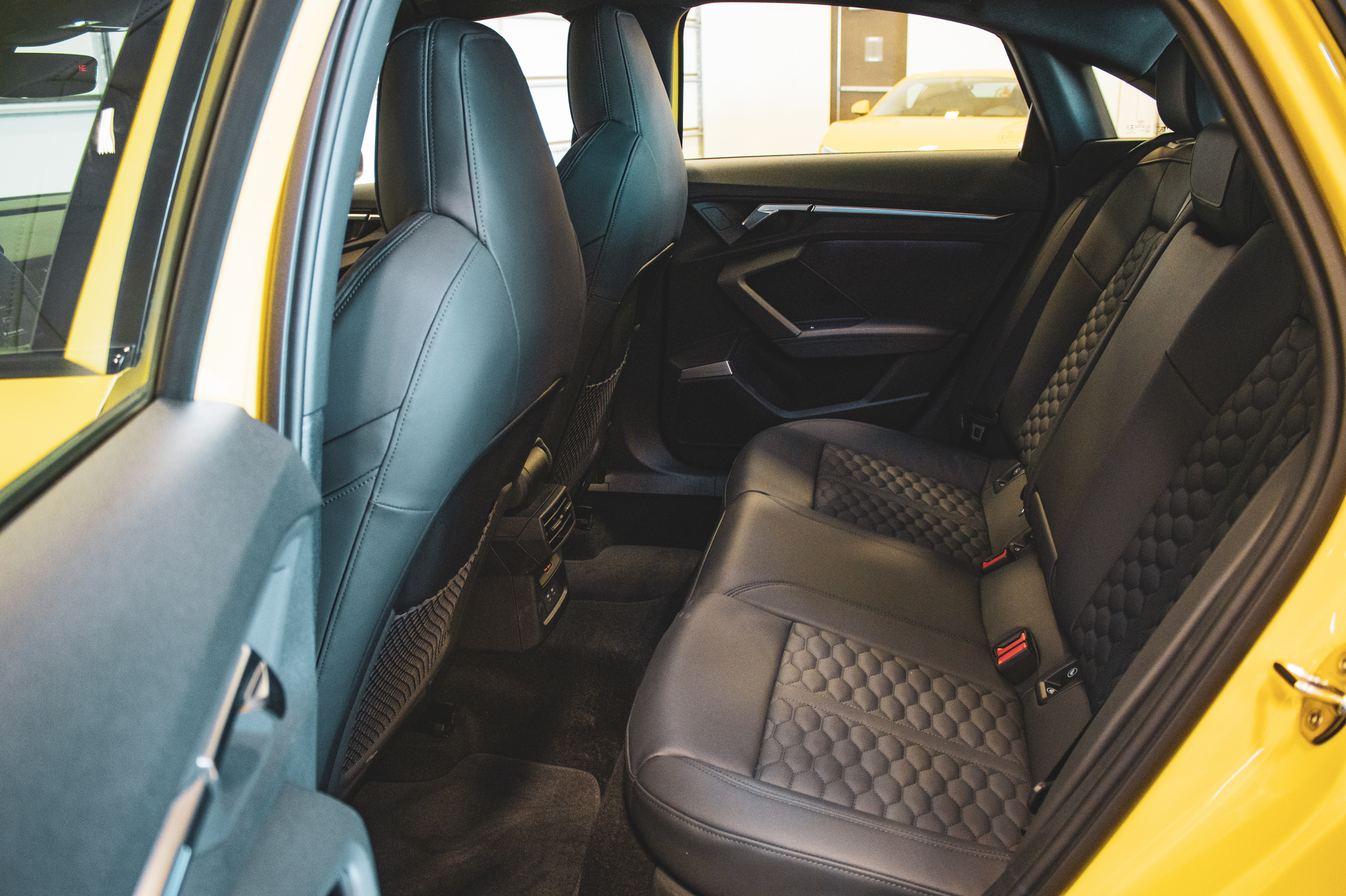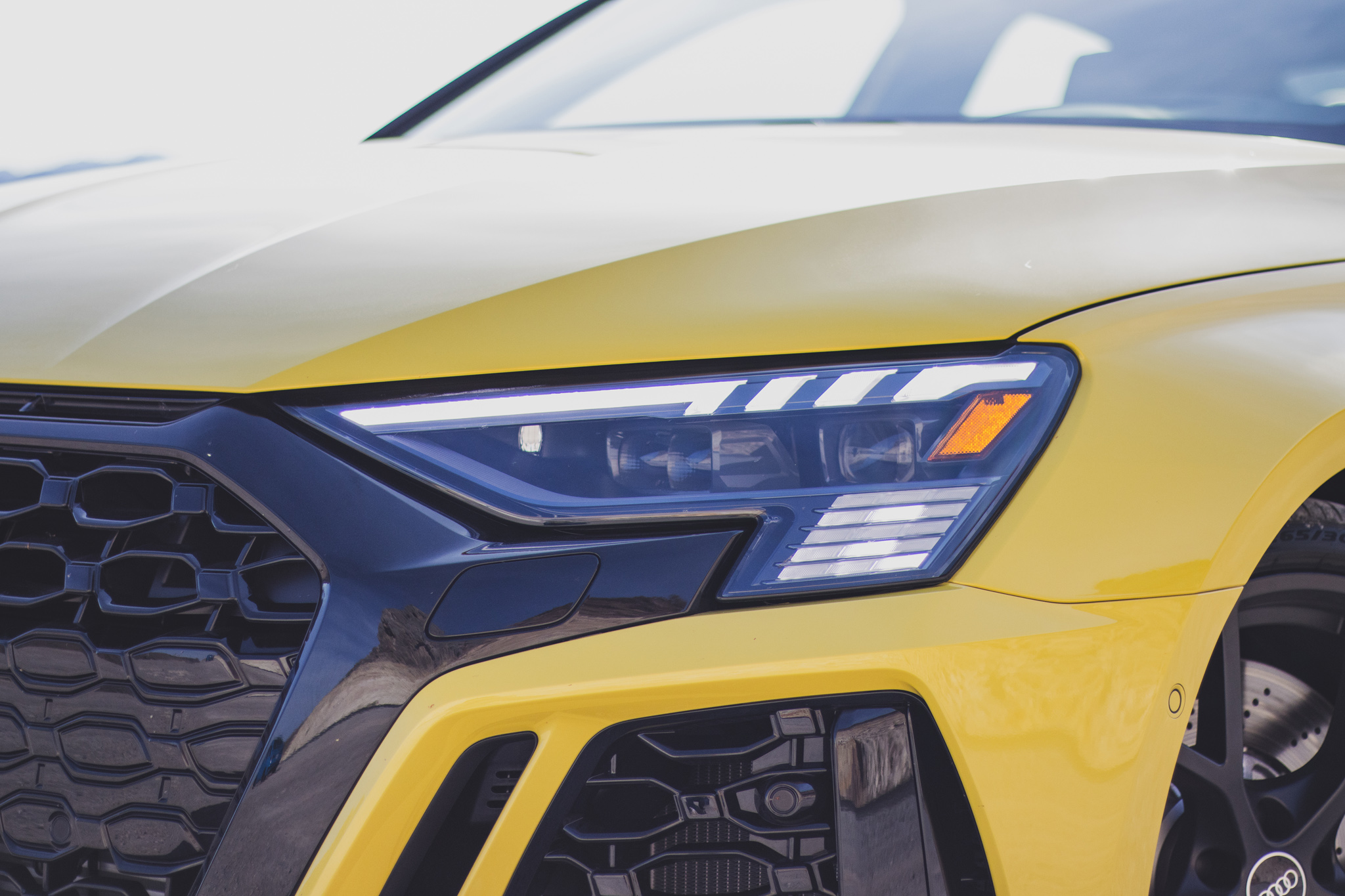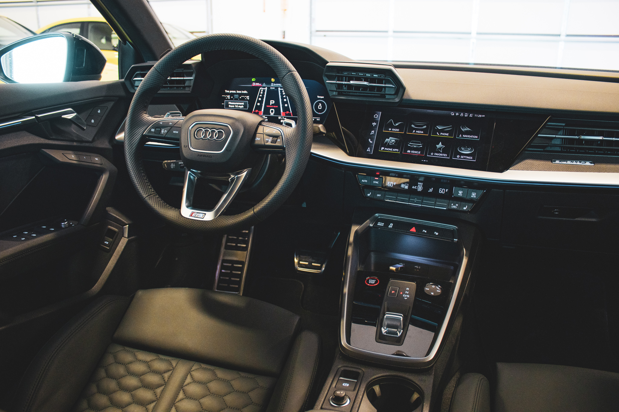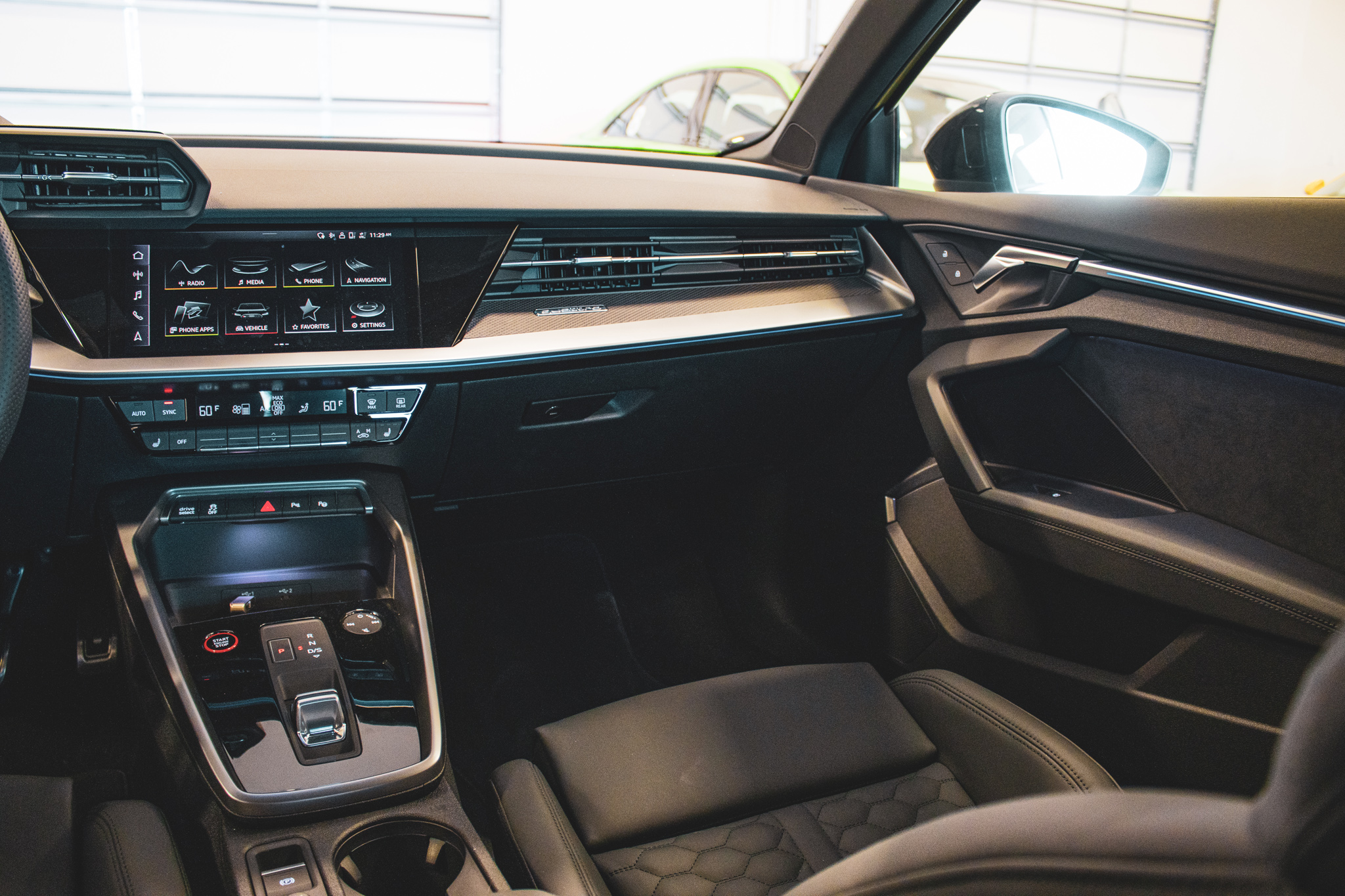 Visually, the Audi RS3 looks the part—a hungrier-looking grille, bigger air intakes and flared fenders, a lowered ride (minus 10 mm compared to the S3), an RS-exclusive Kyalami Green paint, and of course the new checkered-flag DLRs that can alternate to spell out the car’s name when you first turn it on. It’s a bit of theatricality that either comes across as a fun accent or a gimmick depending on your personality.