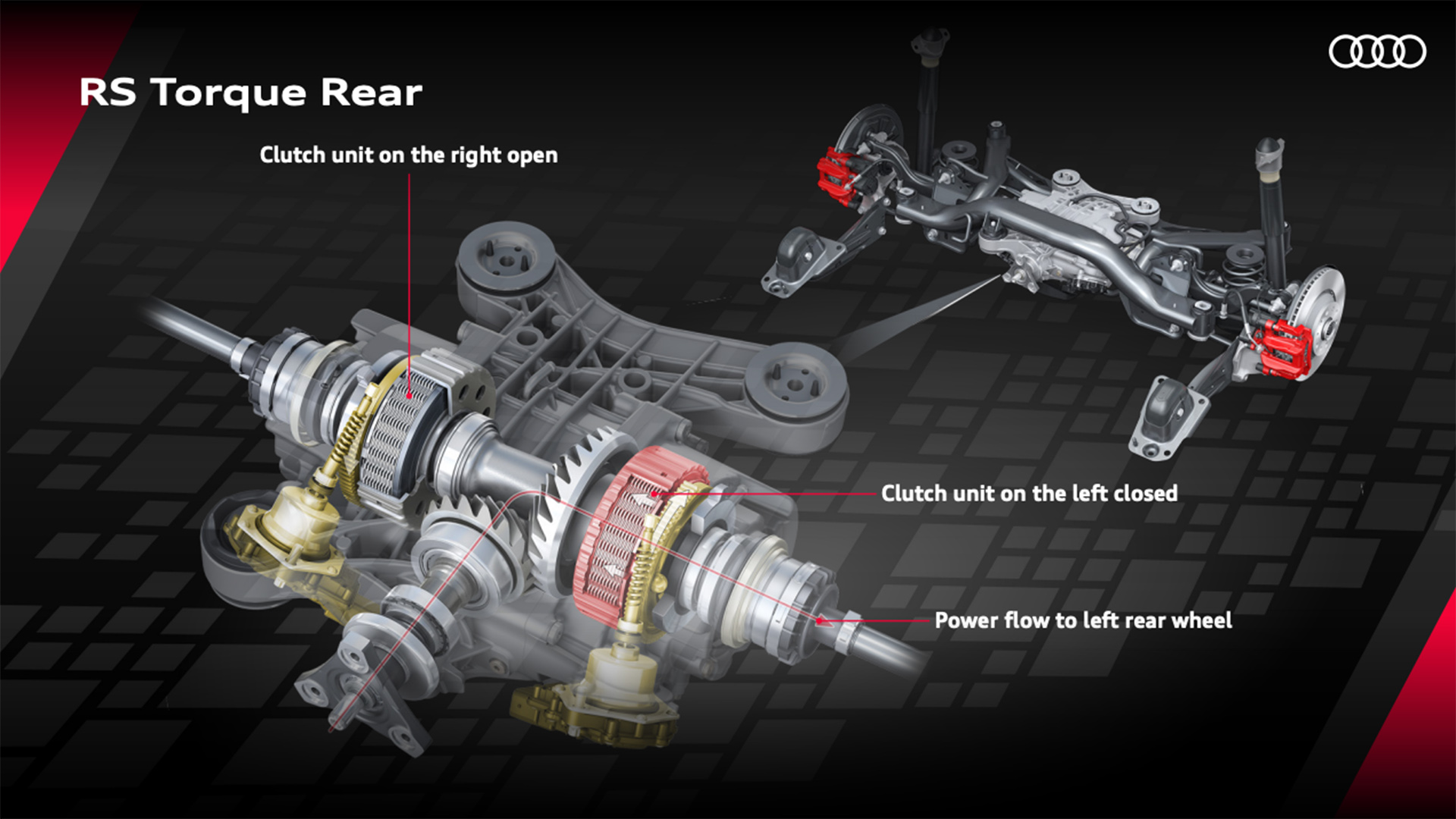 Sitting between the rear wheels, the RS Torque Splitter is a special rear differential replacing the old Haldex unit. It features a pair of multi-plate clutches that can handle 50% of the engine’s power, and further shuffle 100% of that to a single rear wheel as needed based on factors like longitudinal and lateral forces, steering angle, and throttle position. In practice, its most useful application is pumping power to the outside wheel in a sharp turn, helping the car to rotate instead of pushing wide as the inner wheel coasts along. But of course, the real prize is that, as advertised, the RS3 can now hold a genuine drift.