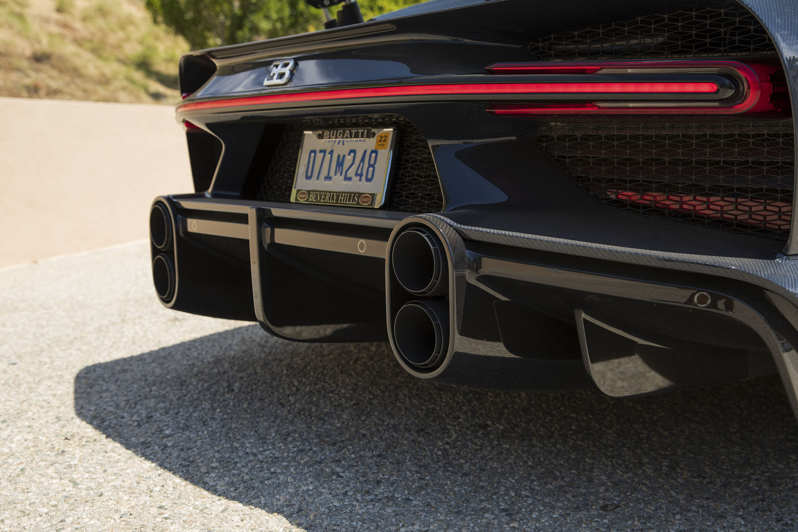 The new diffuser design also necessitated a new exhaust layout. Previous Chiron models have employed a center-mounted design, but the Super Sport gets a pair of dual pipes that are spread out and vertically aligned, along with another pair of downfacing pipes that are hidden further back, which exit through cutouts in the diffuser. The changes that give the rear end of the Super Sport a distinctive look also create a deeper and richer exhaust note.