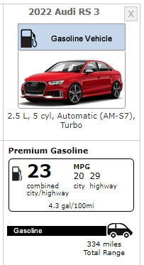 - EPA fuel economy: 15 mpg city/23 highway (manual)