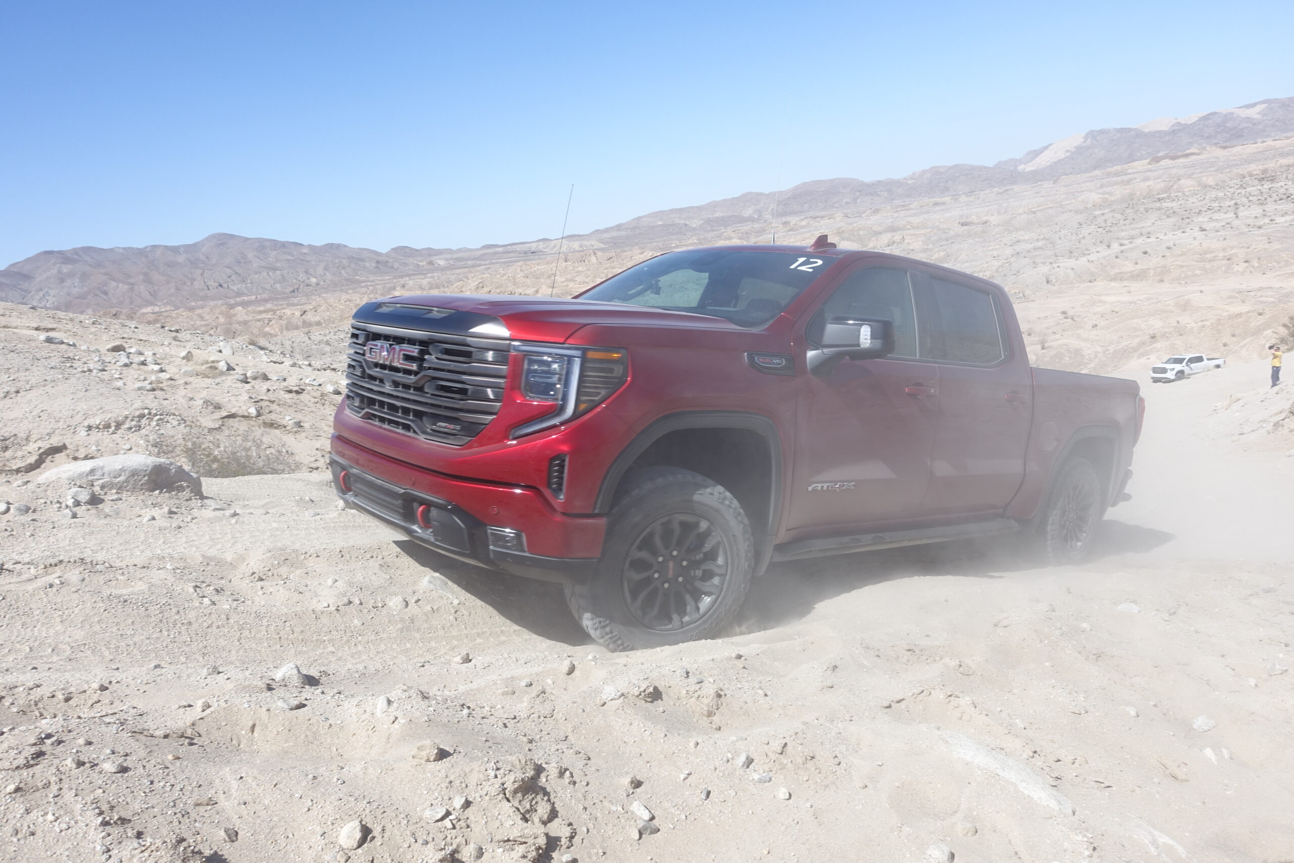 After about an hour of cruising through the dry washes and sandy canyons, our group arrived at a more technical mogul section. Still in the high range, I crept through the humps and bumps with the rear axle locked and could really feel the suspension working. When I got out of my truck and watched the others go through, I could see the GMC’s tires compress deeply into the fenders and droop down into the holes. This is a truck suspension that works well for slow-speed off-roading.