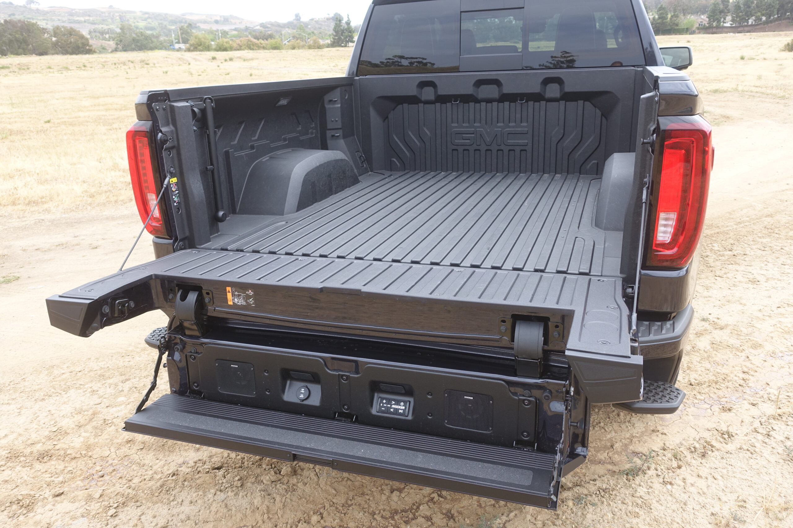The Ultimate has its own grille dressed in what the company calls Vader Chrome—and it’s sweet-looking. The color treatment extends to the trim, too. The dark 22-inch wheels with machined accents are quite handsome. As one might imagine, power side steps are standard here even though this truck isn’t particularly tall. The Ultimate is an all-in model, meaning they included just about every cool feature in GMC’s toolbox. So this rig receives the CarbonPro composite bed along with the six-way folding MultiPro tailgate and the built-in Kicker sound system. And because it comes standard with Super Cruise, GMC redesigned the rear bumper to fit all the short and long-range radar that’s needed for that tech.