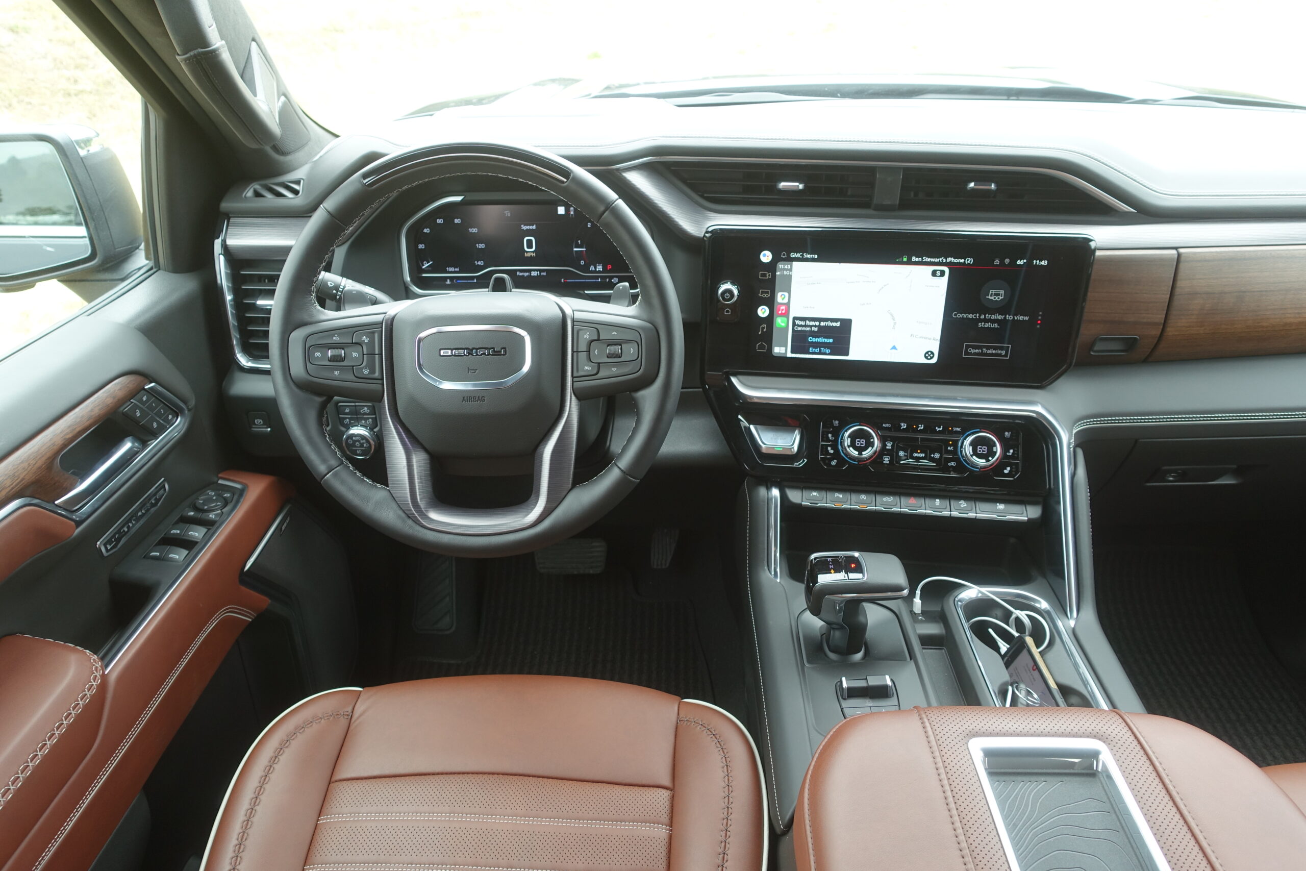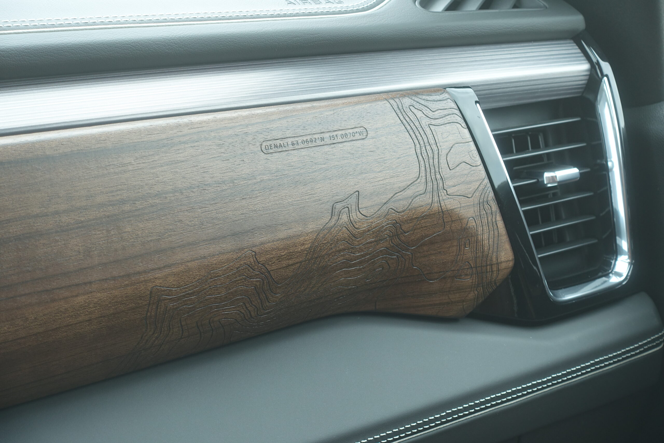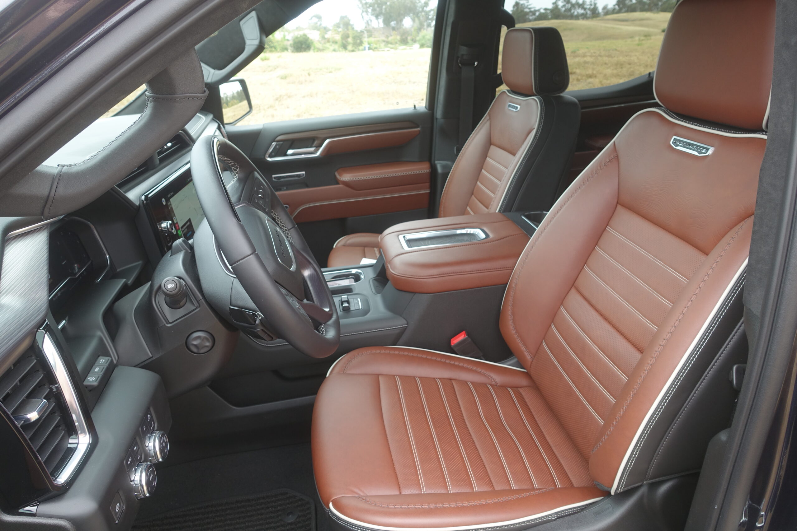 Inside, the Ultimate delivers a cohesive, thoughtful and noteworthy upgrade over other GMCs. The leather is soft and the special wood, open-pore Paldao, is particularly attractive. What’s cool is that GMC has decorated various surfaces with laser-etched topographical maps of Mount Denali. You can see and feel it on the wood trim, the seatbacks and it’s even on the charging pad on the center console. Reach your hand up to the ceiling and you’ll touch the new microsuede headliner. That’s a nice step up from a typical truck interior.