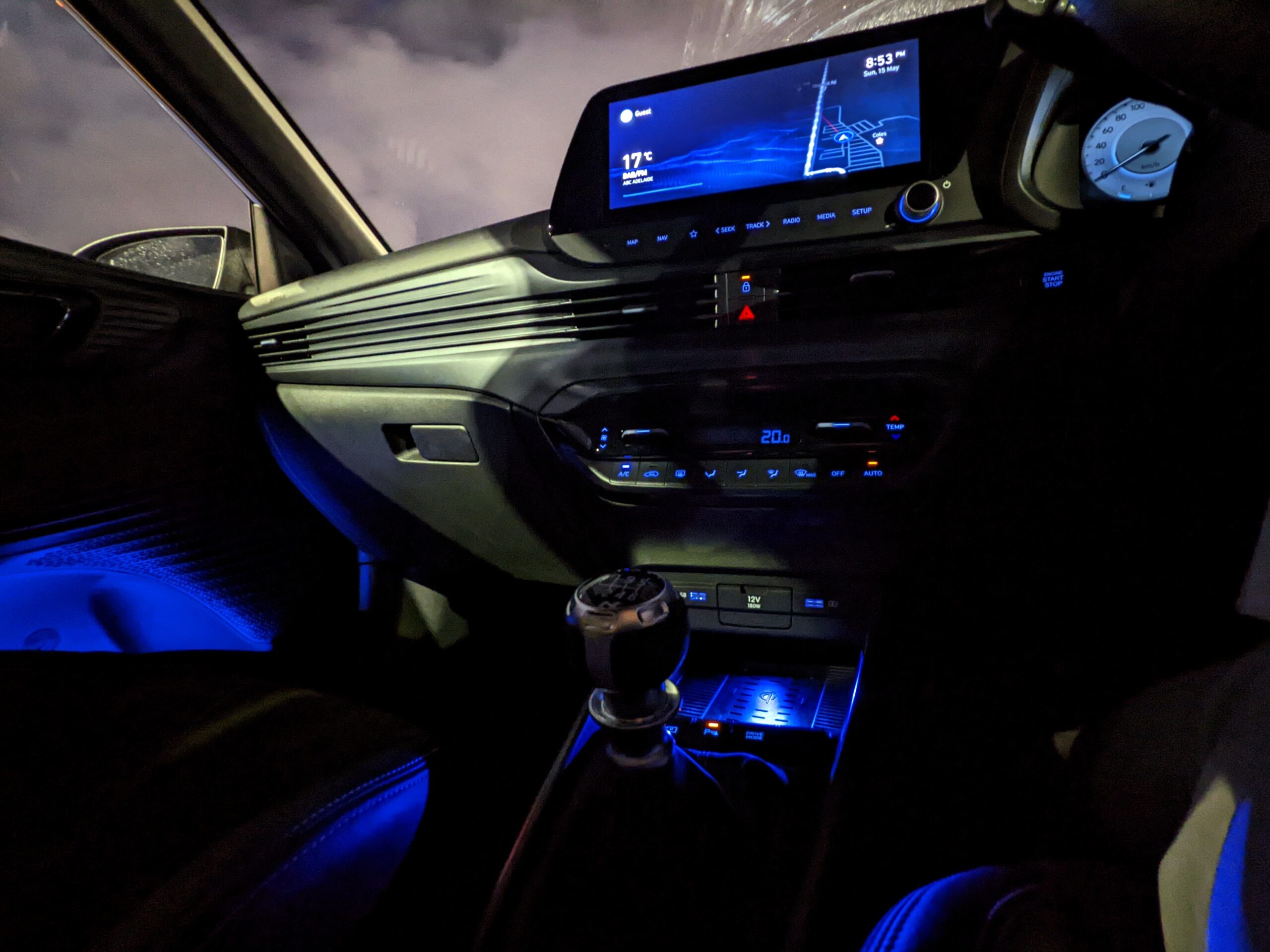 Open the front door, and you’re reminded just how far Hyundai has come in quality terms from the mid-’90s. There’s a satisfying clunk to the latch, and the door swings open to reveal a comfortable yet sporty interior finished in mostly black. The bolstered seats are near enough to racing buckets and give you the right impression from the get-go. A giant red rev-match button on the sport-trimmed steering wheel is a further reminder of the car’s temperament, and blue backlighting in the doors adds a certain sense of theater.